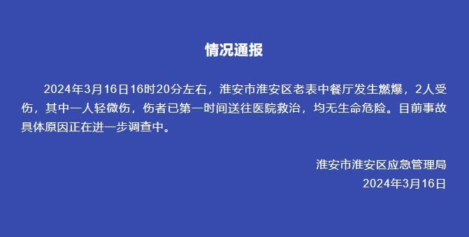 據淮安市淮安區應急管理局發布情況通報,2024年3月16日16時20分左右,淮安市淮安區老表中餐廳發生燃爆,2人受傷,其中一人輕微傷,傷者已第一時間送往醫院救治,均無生命危險。目前事故具體原因正在進一步調查中。