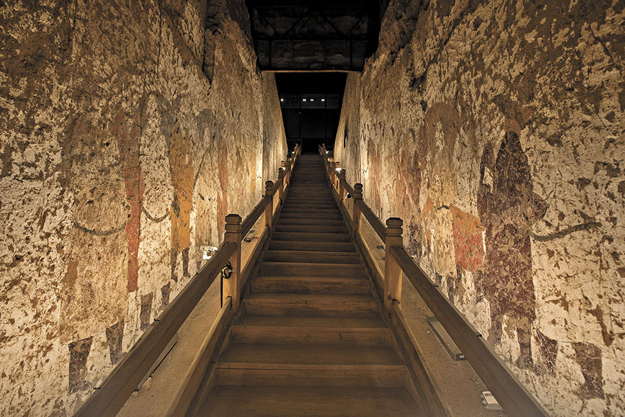 走進北齊壁畫博物館的第二展廳,隔着玻璃門,能看到一條長達20多米的墓道,墓道兩側有充滿歷史感的繪畫印記,再往深處看,正中央就是墓門,門後就是徐顯秀墓室。