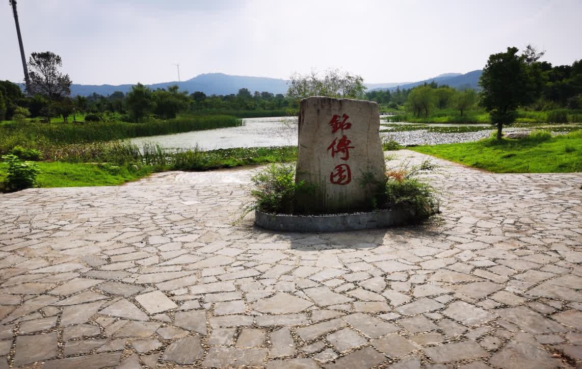 首先見到的是廣場。故居隔着一條道路,道路對面被平整出一片廣場。廣場上矗立着一座高大的石碑,上刻行書「銘傳園」。其後不遠處就是一泓碧水,連着附近的湖泊。當時是盛夏天,近處荷蓮蔓蔓,香遠溢清。湖面近狹遠闊,對岸野樹叢林,再往遠處一片白茫茫,金銀光閃閃,波浪淼淼,盡頭便是一長帶青山貼在藍天下,忽隱忽現,恍如仙山一般。