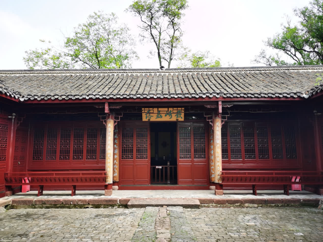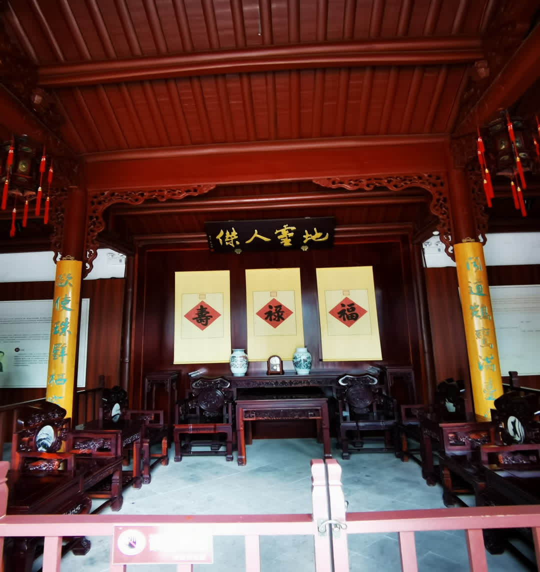 在他最裏間的「地靈人傑」門口有「聞道雞鸞滿台門,欲使珠璧棲窮鄉」。還有在他的「嶔崎磊落」匾額處有兩幅對聯。外一幅是「鶴去難回留片石孤雲共參因果,我來何幸有英雄兒女同看江山」。內一幅是「直道平生幸得江山之助,仁風大化樂參天地之禪」。這些都是他跌宕人生的真切感悟。