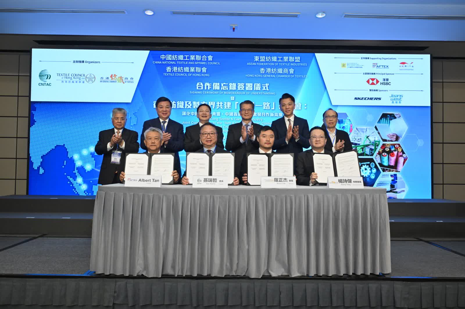 合作備忘錄由中國紡織工業聯合會會長孫瑞哲、香港紡織業聯會會長羅正傑、香港紡織商會常務會長楊詩傑、東盟紡織工業聯盟會長Mr.Albert Tan共同簽訂,並由財政司司長陳茂波、中聯辦副主任尹宗華、紡織及製衣界立法會議員陳祖恒、香港紡織業聯會榮譽會長、香港紡織商會永遠榮譽會長陳亨利博士、香港紡織業聯會名譽顧問、香港紡織商會榮譽會長、旭日集團副董事長兼總經理楊勳先生、晶苑國際集團有限公司董事會主席兼執行董事羅樂風先生共同見證,吸引近250位三地業界精英、政商領袖及企業代表到場參與。