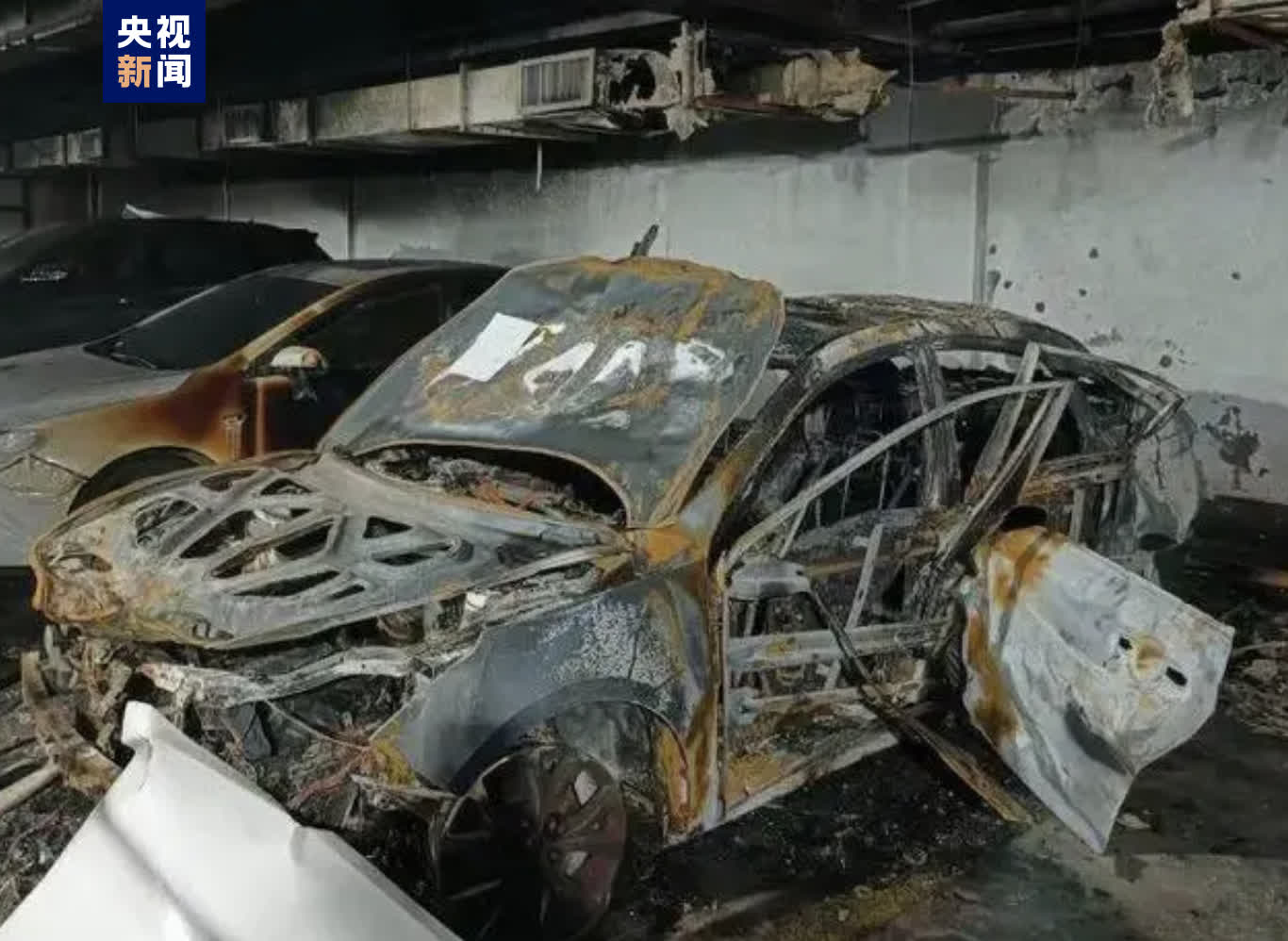 據悉,發生火災的是江畔雲廬1號車庫,位於小區6~10幢樓下,着火的事故車掛着綠牌,現場,事故車輪轂着地,損毀嚴重。