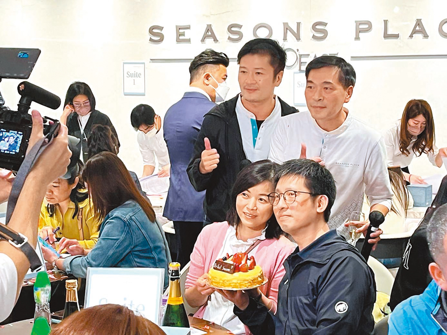 香港文匯報訊(記者 黎梓田)SEASONS PLACE昨日銷情熾熱,當中更有買家(鄭先生)趁買入心水單位的一刻,把握機會向愛人求婚,一同紀念人生的重大日子。會德豐地產副主席兼常務董事黃光耀先生,更特別高歌一曲《一生愛你一個》,以特別禮物、香檳及蛋糕,祝賀一對買家。消息指,該對買家剛好又買了「一對」單位,可謂好事成雙。