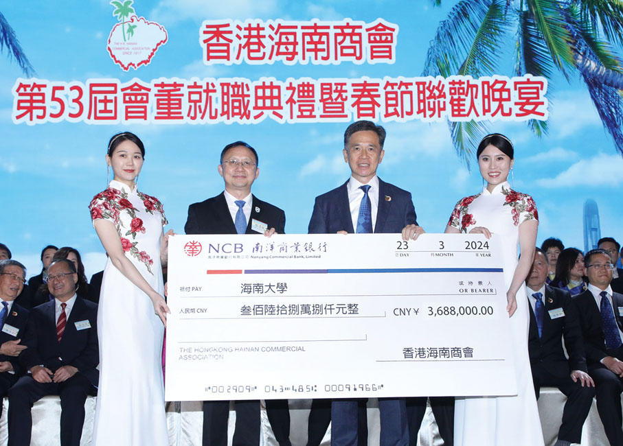 香港海南商會會長潘家德致辭時表示,為了支持家鄉經濟建設,商會同仁帶頭回鄉投資興業,為海南自貿港建設擔當超級聯絡人,積極促進瓊港經貿來往。商會並捐贈368.8萬元人民幣予海南大學,以實際行動持續支持家鄉教育事業。潘家德指出,當前香港新經濟動力不斷顯現,社會活力持續增強,展現穩定繁榮、由治及興的喜人景象。香港一直是海南最主要的外資來源地,也是海南最大的服務貿易夥伴,海南自貿港建設以來,瓊港兩地經貿、科技、文化、旅遊等領域往來非常密切,誠邀香港和海外企業以及個人到海南自貿港投資,抓住千載難逢的機遇,開啟事業新篇章。