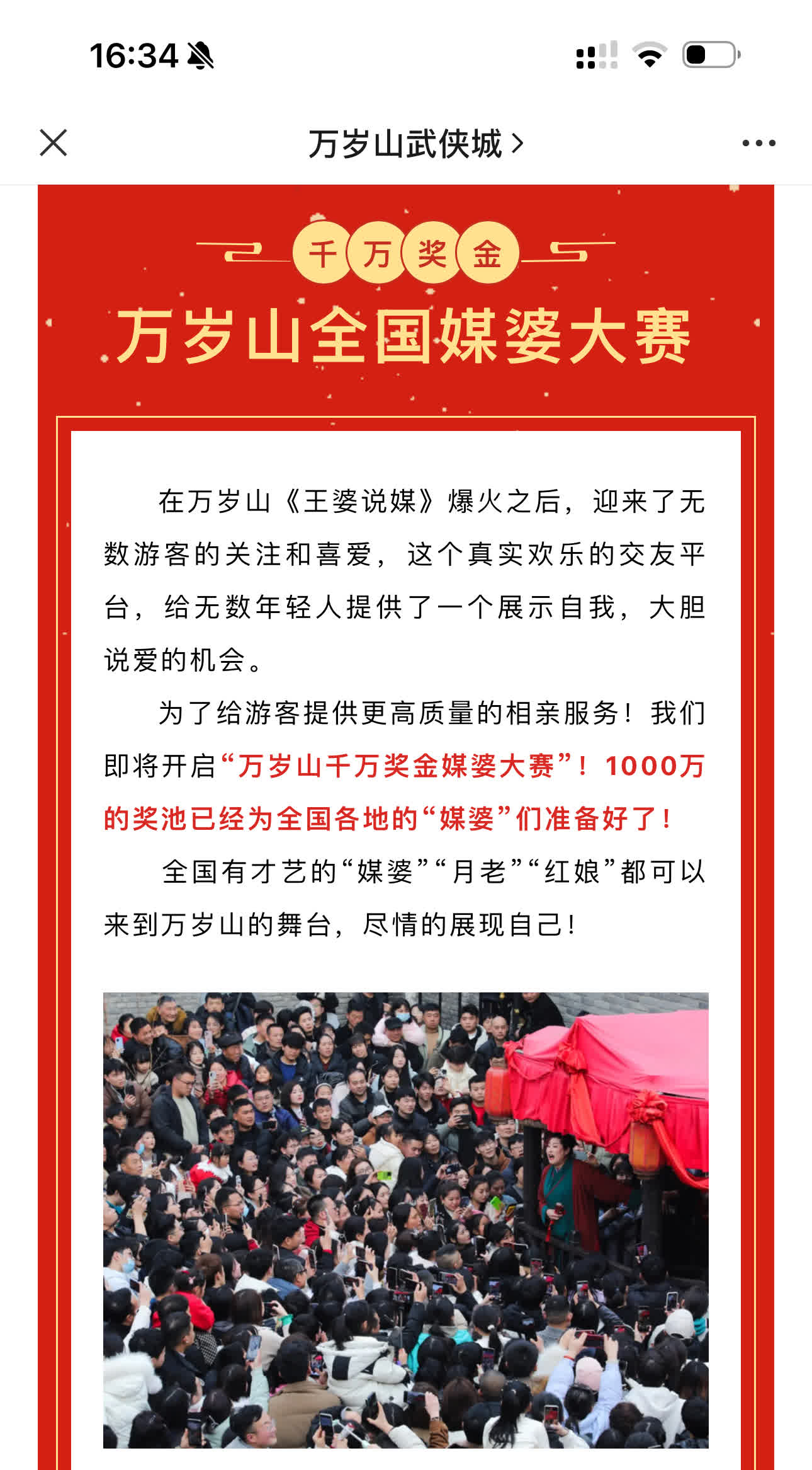 歲山武俠城官方公眾號稱,萬歲山《王婆說媒》爆火之後,迎來了無數遊客的關注和喜愛。為了給遊客提供更高質量的相親服務,景區即將開啟「萬歲山千萬獎金媒婆大賽」。全國有才藝的「媒婆」「月老」「紅娘」都可以來到萬歲山的舞台,盡情展現自己。