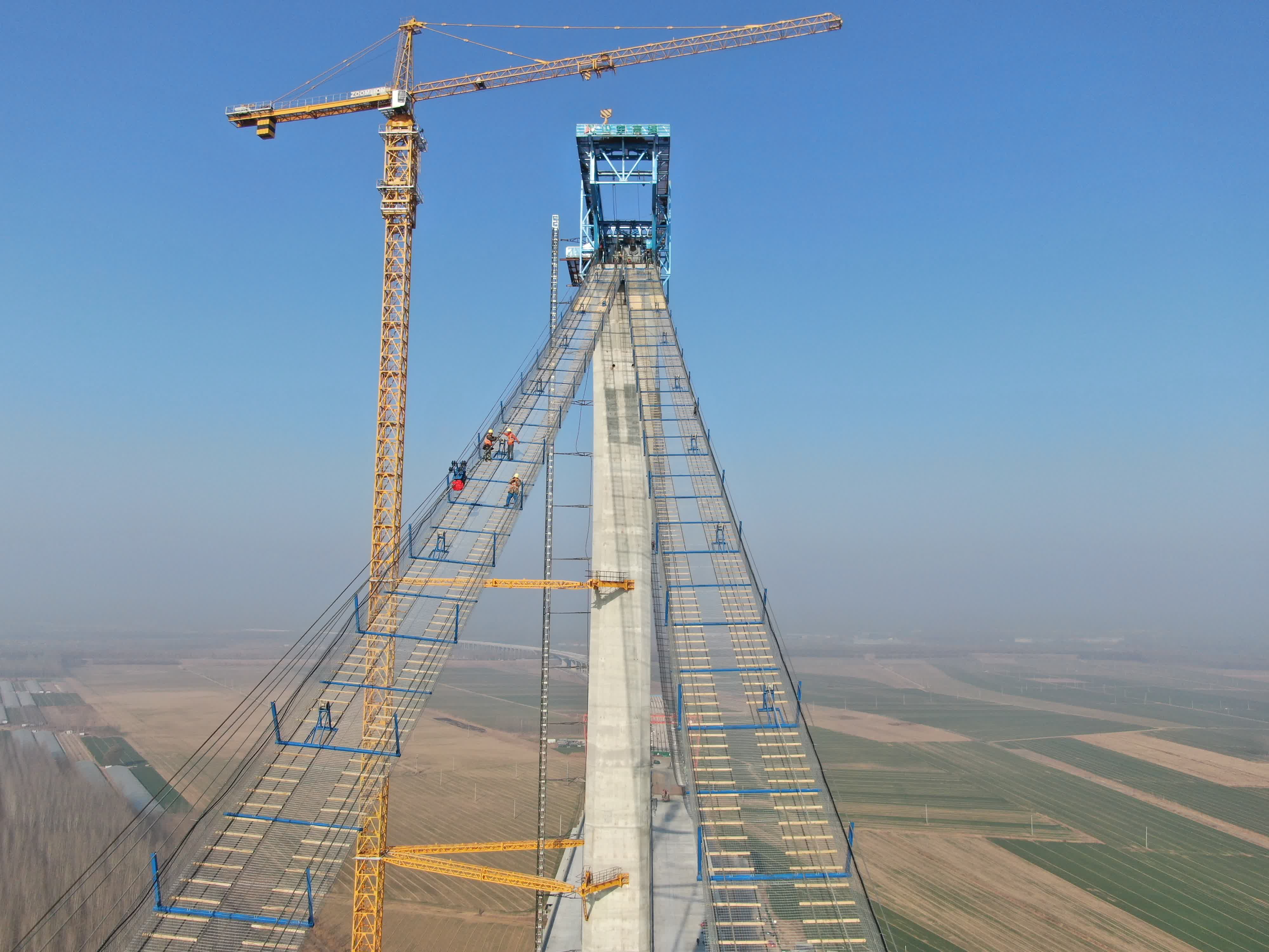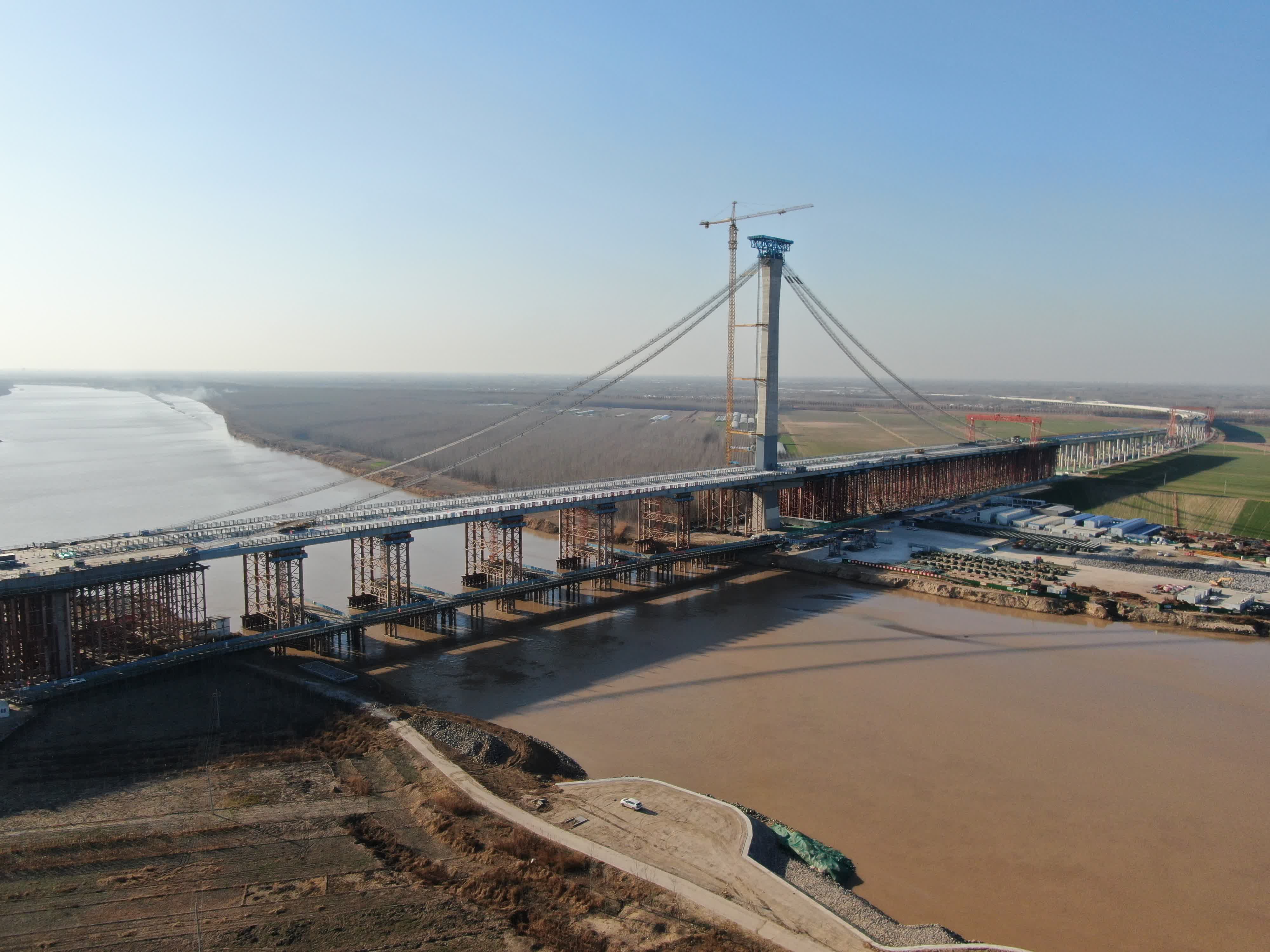 黃河特大橋主纜為空間纜線形,共有2根主纜,每根主纜共有61股索股,每根索股由127根直徑5.8毫米、強度1960MPa的鍍鋅鋁合金鋼絲組成,主纜架設方式為雙線往復式牽引。記者在施工現場看到,目前黃河特大橋主纜架設已全部完成,緊纜施工預計4月底全部完成。