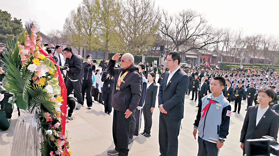 菊花朵朵祭英烈,清明時節念英雄。「清明節的銘記——緬懷英烈志 築夢現代化」主題教育系列活動啟動儀式3日在中國人民抗日戰爭紀念館舉行。抗戰老戰士代表、96歲高齡的八路軍老戰士鍾信帶領學生代表在獨立自由勳章雕塑前向英烈獻花。獻花後,老戰士拒絕攙扶獨自站立向死難戰友們敬禮,而他顫抖着行禮的右手久久沒有放下。這個敬禮不僅是對在戰火中獻出生命和鮮血的戰友們懷念,也是對中國今日和平發展的敬意。