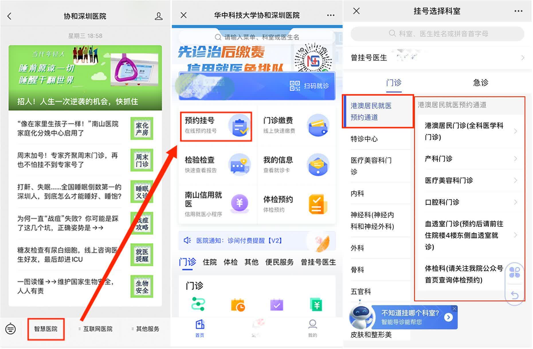 (香港文匯網記者 郭若溪)港人北上就醫持續火熱。近日,華中科技大學協和深圳醫院(南山醫院)開通了「港澳居民就醫預約通道」,到醫院就醫的港澳居民日益增多,尤其是體檢、全科、口腔、醫美等科室受青睞,手術不用排隊、門診服務多、價格低、交通方便等都是港澳居民選擇來南山就醫的理由。港人就醫直接搜索「協和深圳醫院」公眾號,進入智慧醫院,即可直接預約挂號。