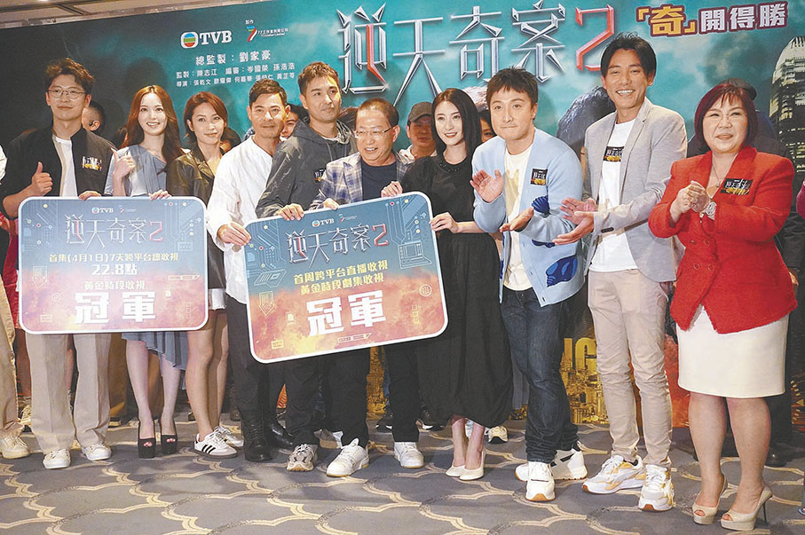 香港文匯報訊(記者 子棠)陳展鵬、林夏薇(薇薇)、方力申(小方)、馮盈盈、張頴康、劉佩玥、張子丰等一眾《逆天奇案2》劇集演員,與總監製劉家豪及編審岑國榮前晚相約飯聚,齊齊觀看劇集直播,並於席間公布連番喜訊。劉家豪首先宣布《逆天2》成為首周跨平台直播收視黃金時段劇集冠軍、及7天跨平台錄得22.8點的收視;岑國榮再接力指劇集打入內地全網播放率首十位,有效播放量已過1千萬,還榮登內地某影視平台男人愛看電視劇第一位,笑言下一個目標要「搞掂埋啲女人」(女人愛看的電視劇)。眾演員興奮地重演劇中的經典甫士,並齊齊舉杯慶祝。