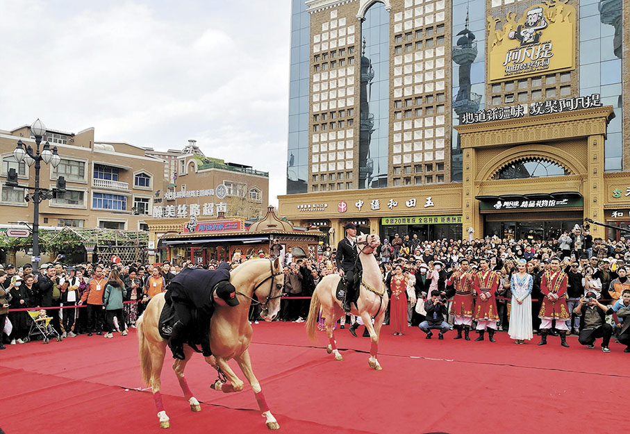 香港文匯報訊(記者 應江洪 新疆報道)11日18時,伴隨着歡快熱鬧的民族歌舞表演,位於新疆烏魯木齊市城南的新疆國際大巴扎步行街正式「開街」。來自野馬集團的三匹汗血寶馬在馴馬師的引導下,或噴鼻鳴叫、或馬首高揚、或屈膝施禮,引得現場遊客不斷高呼、鼓掌,並紛紛追趕着圍觀這些汗血寶馬在大巴扎景區巡遊、展示。