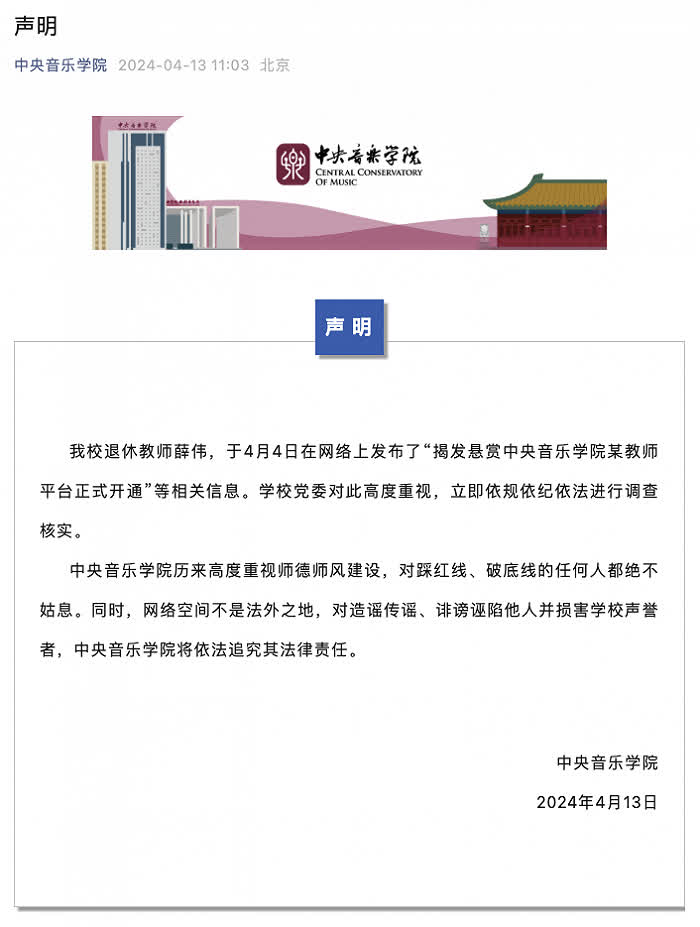 中央音樂學院4月13日發布聲明稱,該校退休教師薛偉,於4月4日在網絡上發布了「揭發懸賞中央音樂學院某教師平台正式開通」等相關信息。學校黨委對此高度重視,立即依規依紀依法進行調查核實。中央音樂學院歷來高度重視師德師風建設,對踩紅線、破底線的任何人都絕不姑息。同時,網絡空間不是法外之地,對造謠傳謠、誹謗誣陷他人並損害學校聲譽者,中央音樂學院將依法追究其法律責任。