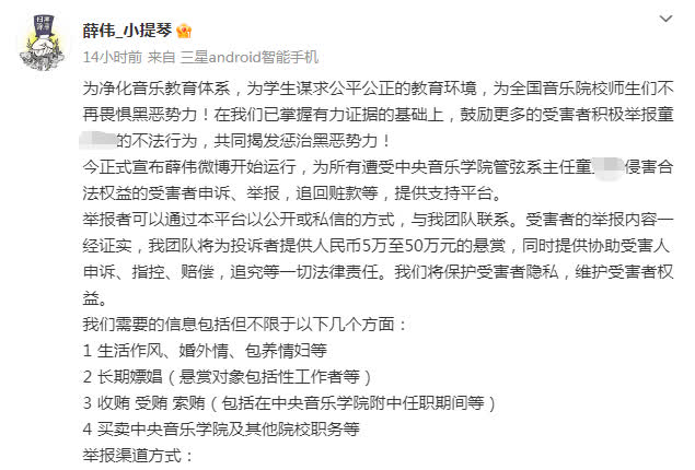近日,一位賬號簡介為「中央音樂學院教授薛偉」的微博賬號發帖稱,公開懸賞徵集同校管弦繫主任童某某違法線索。舉報內容顯示,他們已經掌握了有力證據,同時也向更多受害者徵集童某某的不法行為,共同揭發懲治黑惡勢力,其中包括但不限於以下幾個方面:1、生活作風、婚外情、包養情婦等;2、長期嫖娼;3、收賄受賄索賄;4、買賣中央音樂學院及其他院校職務等。同時稱,「將為投訴者提供人民幣5萬至50萬的懸賞」。