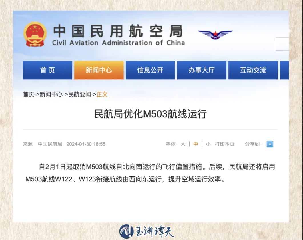 譚主注意到,此次消息中的M503航線,在1月30日民航局發布的消息中也曾出現: