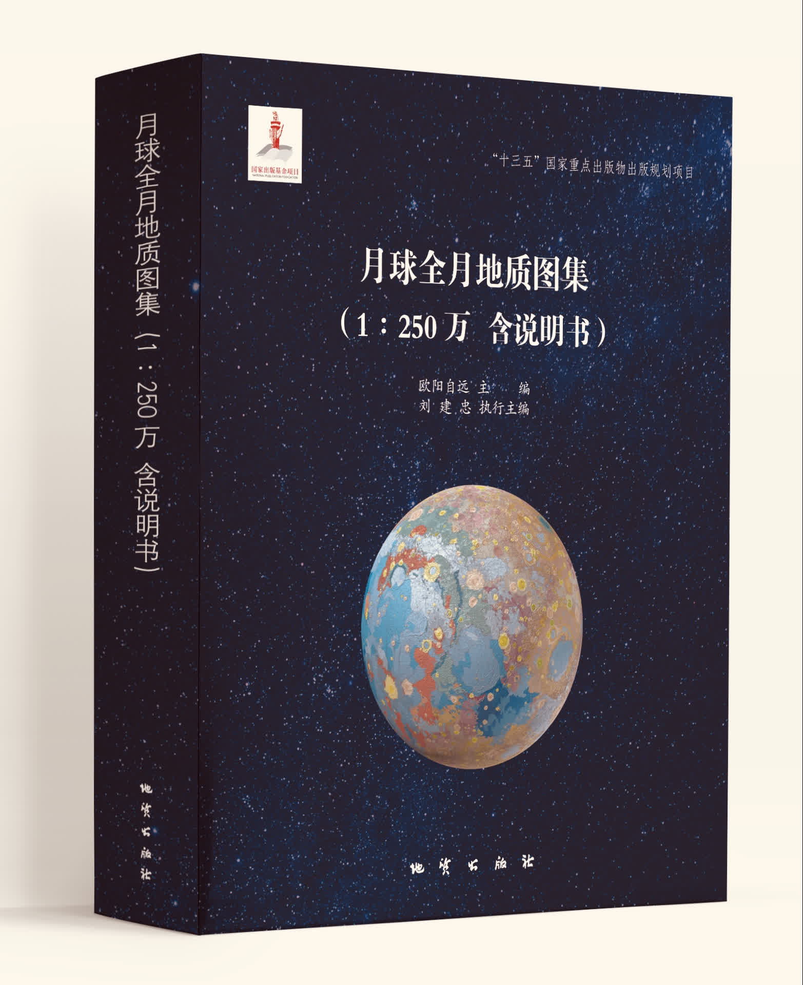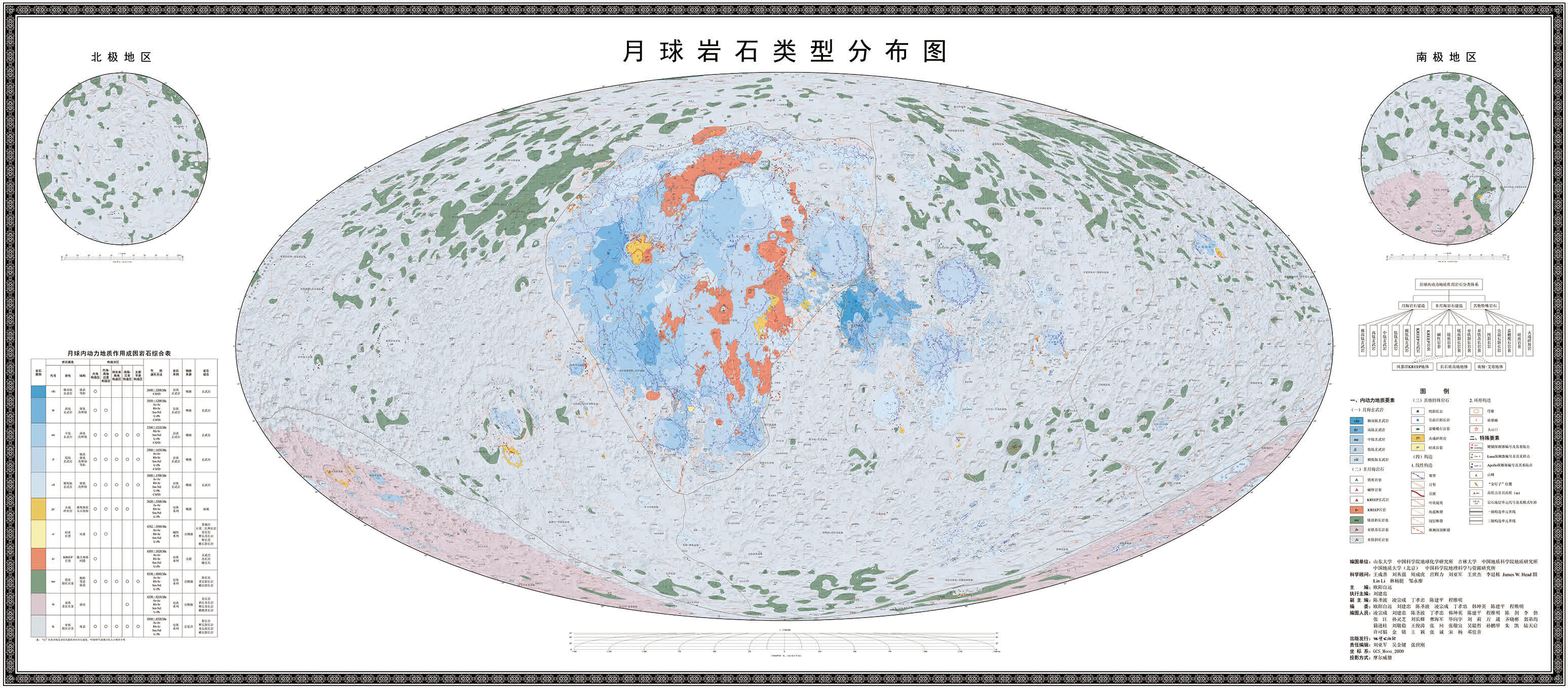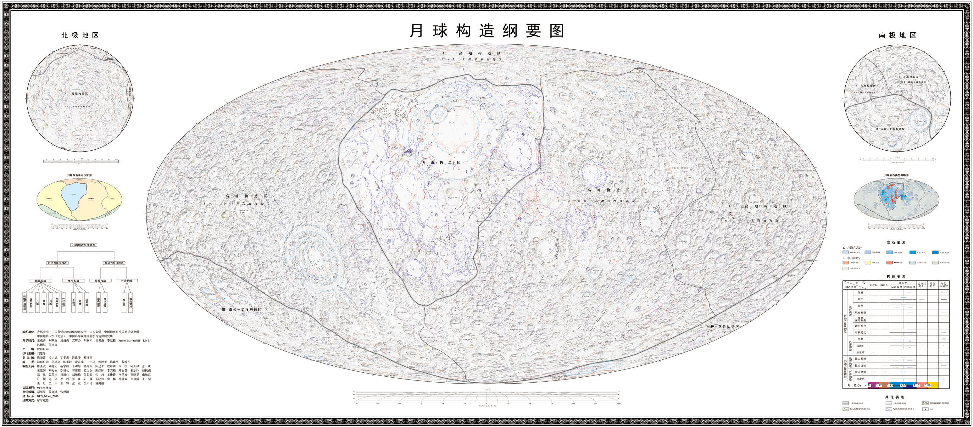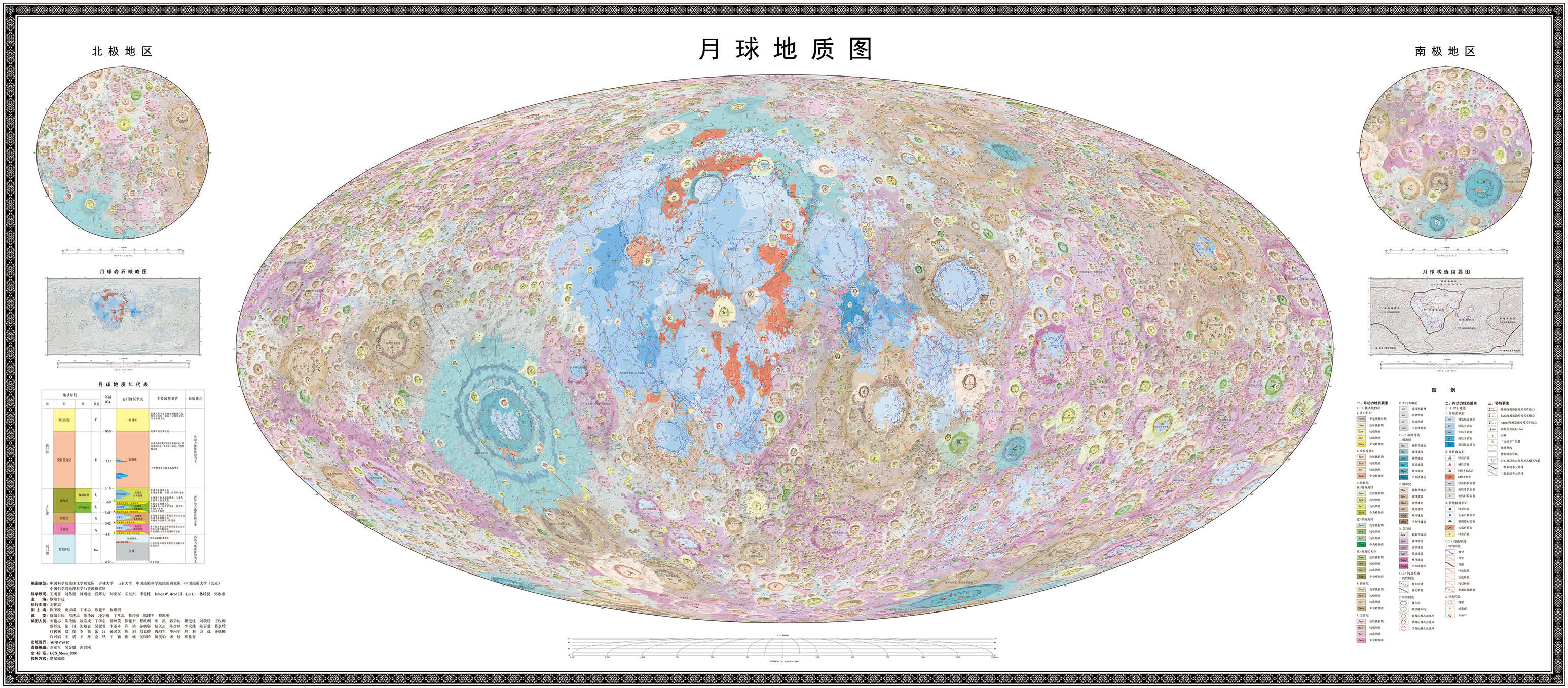此次發布的圖集採用中英文雙語編制,其中主圖《1:250萬月球全月地質圖》利用青、黑、黃、品紅4個基色疊印出共150種顏色,對月球進行「三宙六紀」的地質年代劃分;識別並標記全月12341個撞擊坑、81個撞擊盆地、17種岩石類型、14類構造,建立了統一的盆地建造亞類的分類體系。同時,圖集還表達探測着陸點、特殊高程點等一些特殊要素。此外,說明書與圖集同步發布,詳細介紹了編圖使用的數據、圖件比例尺選擇原則、圖面表達內容、「三宙六紀」月球地質年代劃分方案、構造和岩石類型分類體系和月球地質演化歷史等內容。