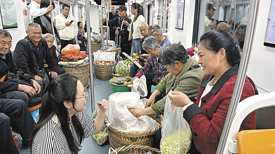 跟隨劉貴文一起進城途中,香港文匯報記者留意到與當地其他地鐵不同,四號線每隔兩個車廂就會配備一名工作人員,他們大多站在車廂門口,不坐座位。「大多數老人家需要在保稅港站換乘,換乘時間很短,我們幫助他們做好下車準備。」其中一名工作人員告訴香港文匯報記者。保稅港到站後,這名身着制服的工作人員立即用重慶話提醒一位頭髮花白的菜農,「到了,搞快一點。」然後迅速挑起沉重的扁擔小跑到對面的九號線。「謝謝你小伙子」,老人也顫巍巍地跟着跑來。「不存在」(重慶方言,意為「不客氣」,編者註),地鐵工作人員笑嘻嘻地擺手,迅速折返,去幫助其他菜農。