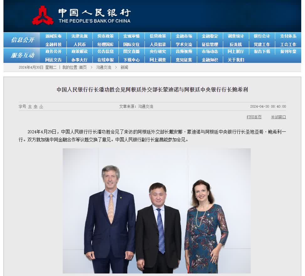 2024年4月29日,中國人民銀行行長潘功勝會見了來訪的阿根廷外交部長戴安娜·蒙迪諾與阿根廷中央銀行行長聖地亞哥·鮑希利一行。