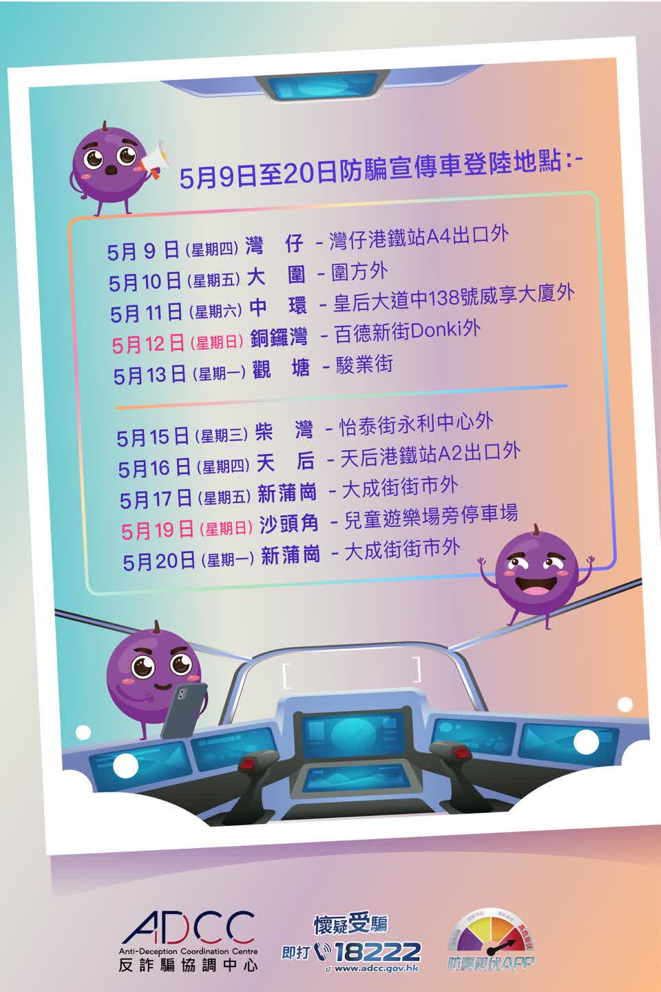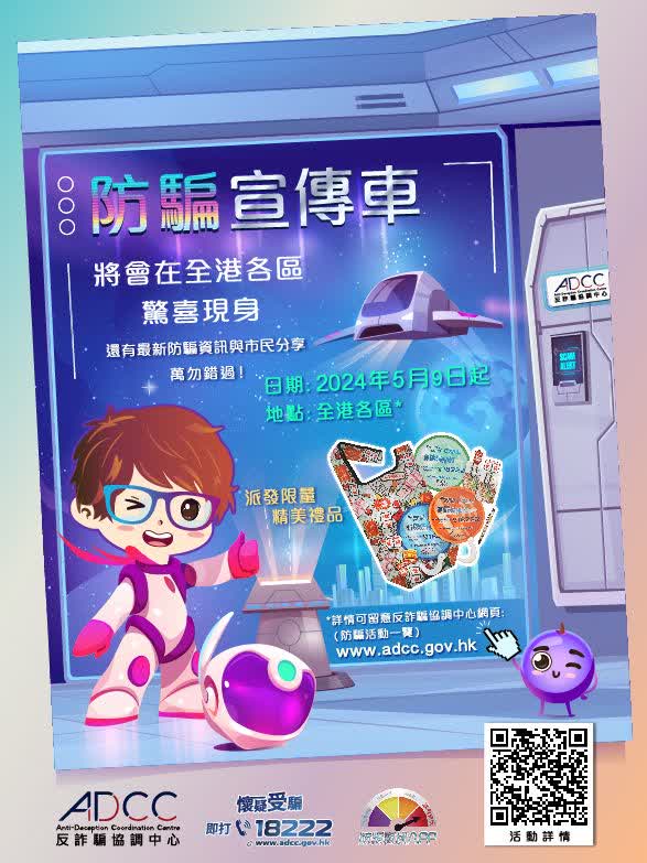 由5月9日起,「反詐騙協調中心」的「防騙宣傳車」會在全港各區驚喜現身,向市民宣傳防騙資訊同派發限量紀念品。市民還可以參與互動遊戲,學習辨識最新詐騙手法!