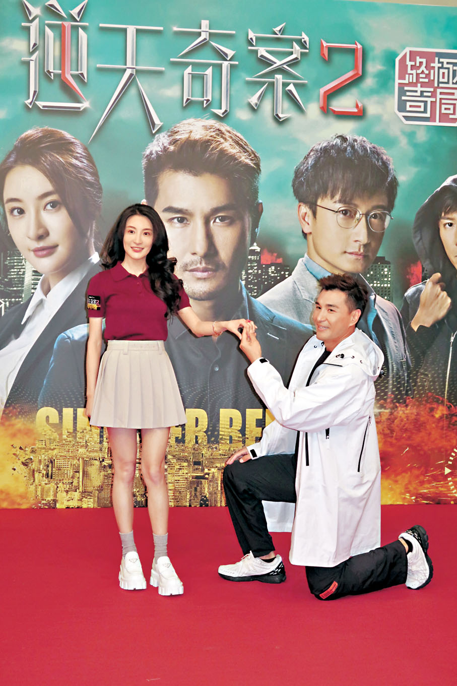 香港文匯報訊(記者 梁靜儀)陳展鵬、林夏薇(薇薇)、劉佩玥(Moon)、馮盈盈、方力申、張頴康及蔣祖曼等,昨日出席無綫劇集《逆天奇案2》宣傳活動,展鵬更下跪送上紙戒指向薇薇求婚,重演求婚一幕。