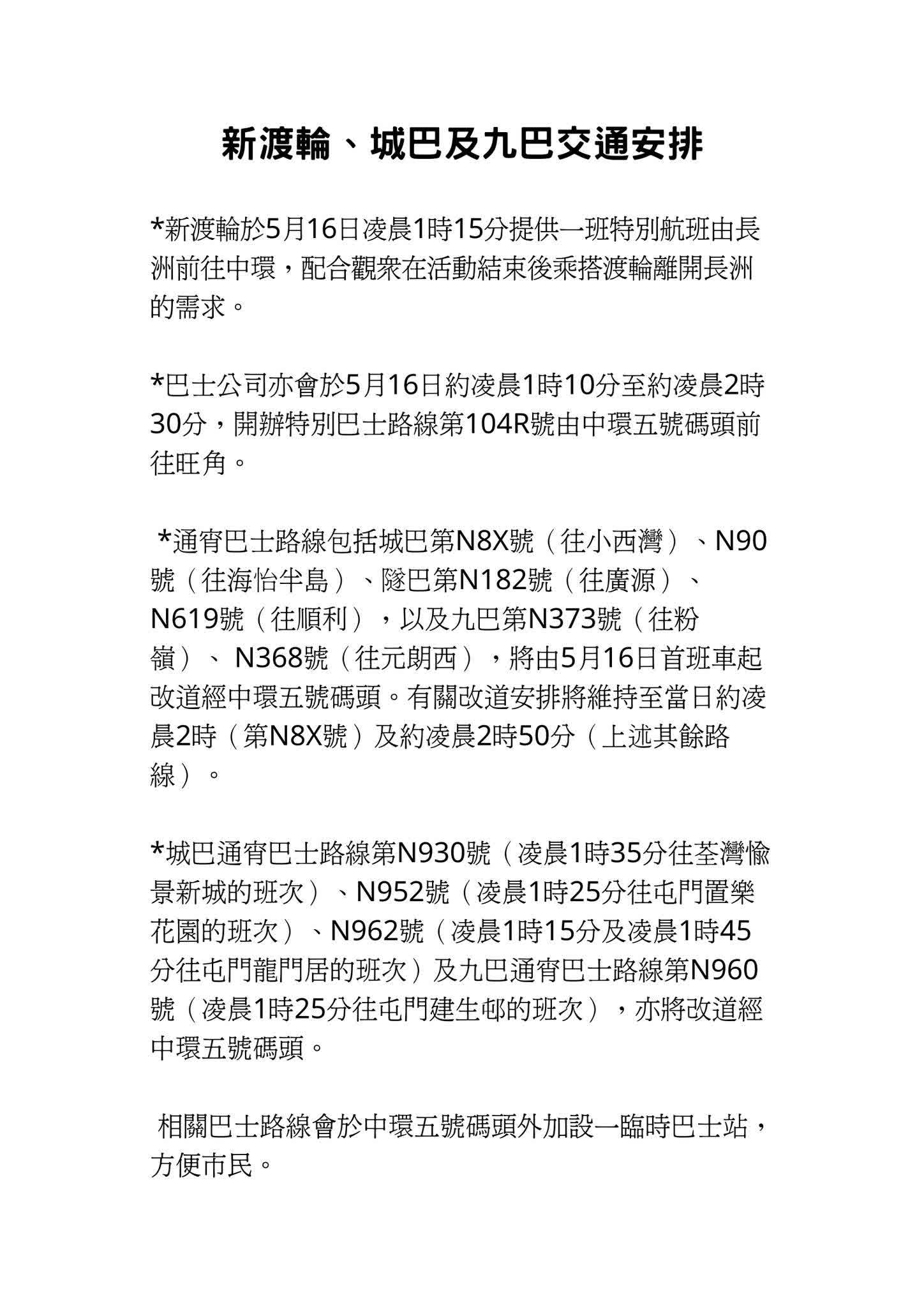 警方將實施人群管制措施,並呼籲市民遵守警方及主辦單位工作人員的指示,在人多擠迫的時候耐心忍讓。而新渡輪及巴士公司會加開特別班次疏導人潮(詳見下表)。