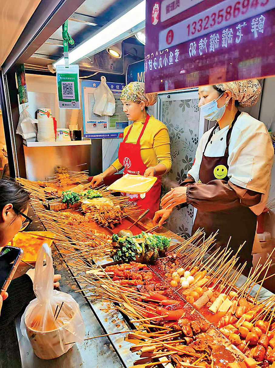 4月11日晚上,從杭州來的遊客王女士說。「4天線上平台銷量達4萬單!寧夏辣糊糊底料訂單量暴漲,200多人每天加班發貨。」寧夏 「寧楊」食品廠家負責人興奮地說。小份10元、大份15元,也可以自己選串串,1串1元,一個人30塊就能吃飽吃好。寧夏土豆片香糯,牛筋條Q彈,根本停不下來!來自深圳遊客陳小芸和朋友在銀川懷遠文旅觀光夜市大飽口福。「沙湖的景美,沙湖辣糊糊香。坐在遊船邊看美景邊吃辣糊糊,這種感受真美!」