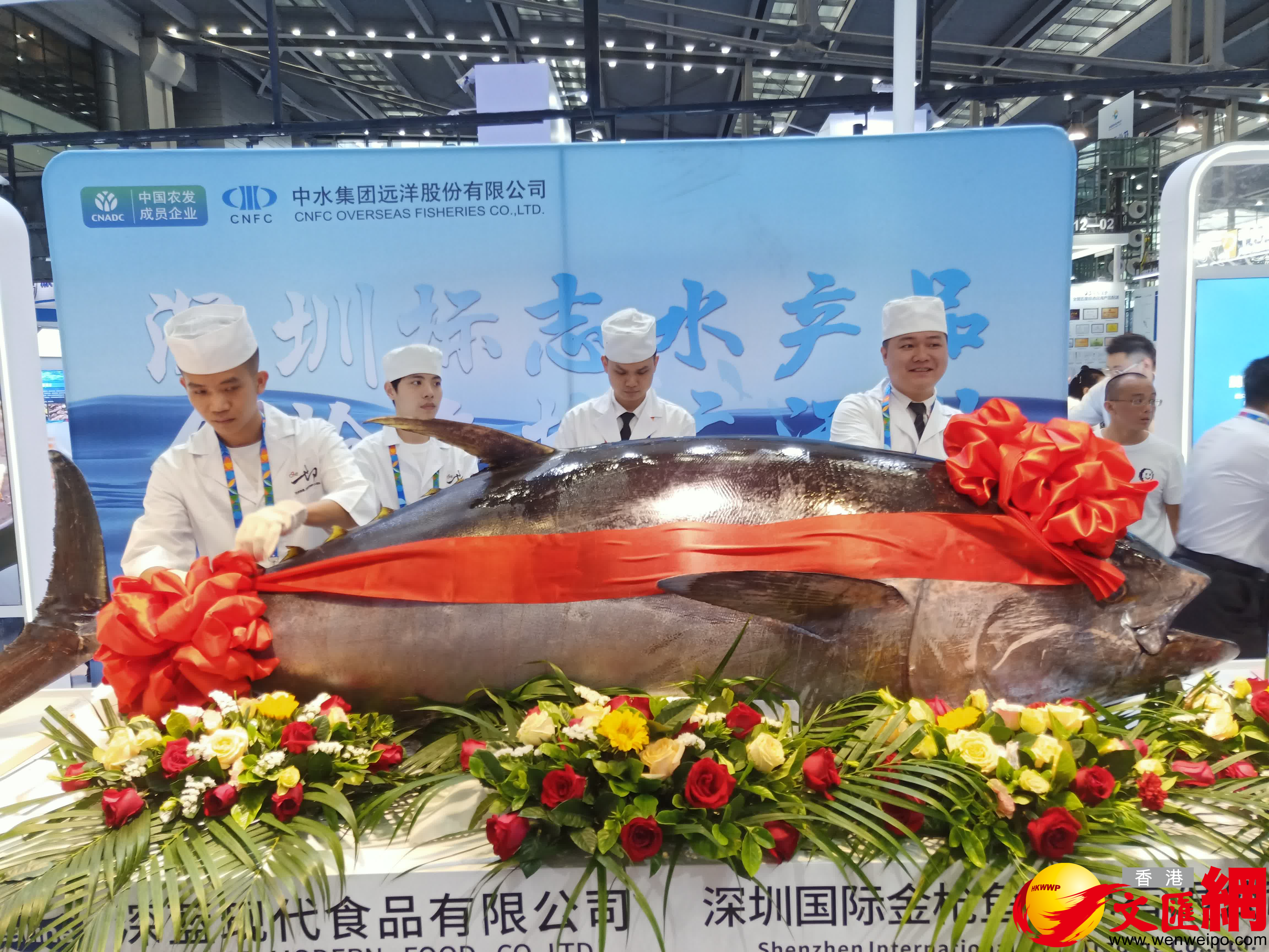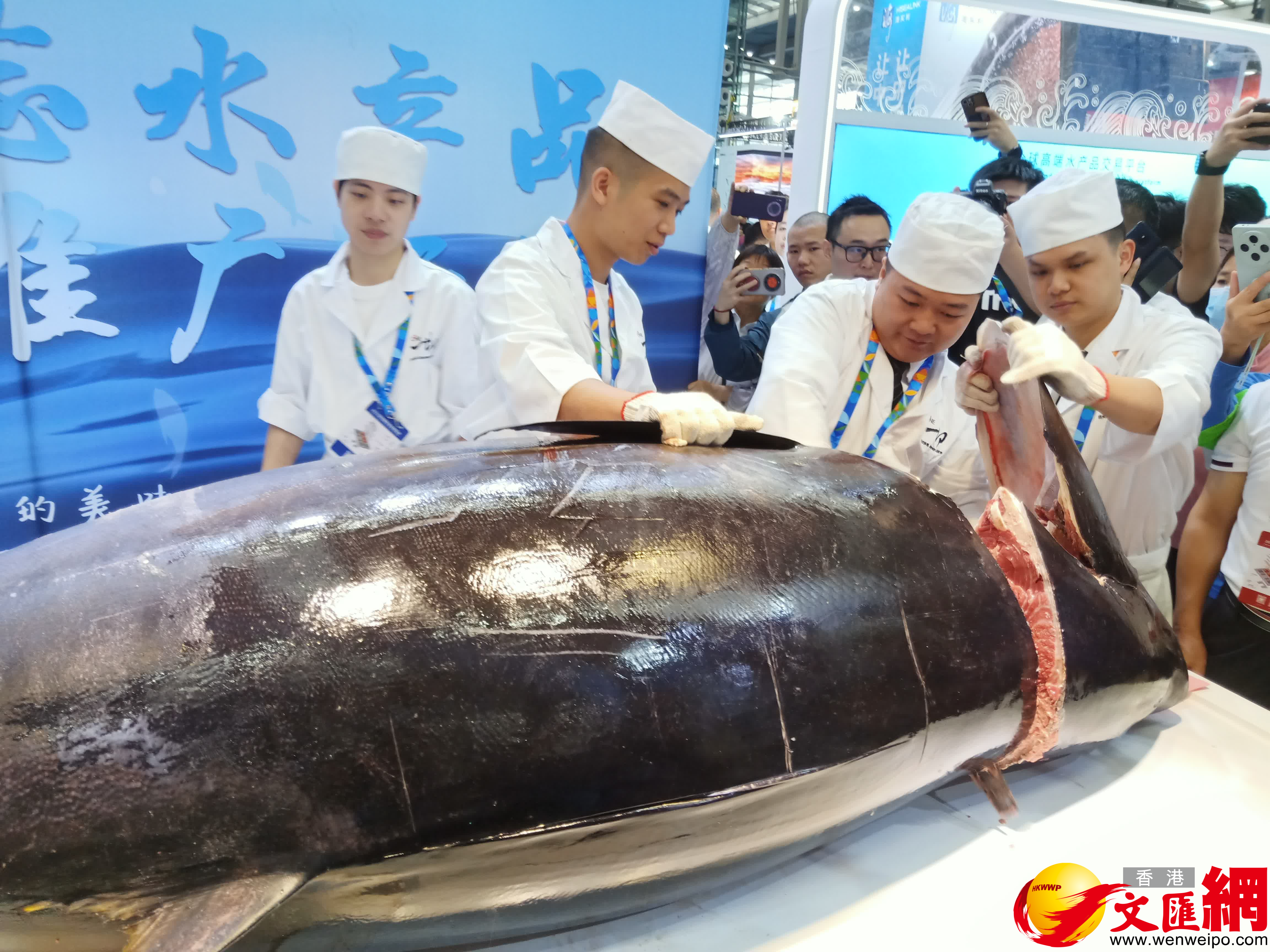 (香港文匯網記者 毛麗娟)今天上午,2024深圳國際漁博會在深圳福田會展中心正式開幕,一條超300公斤重的金槍魚在「切魚秀」現場登場,資深廚師大秀切魚手法,該條魚現切現賣,市民可現場試吃。