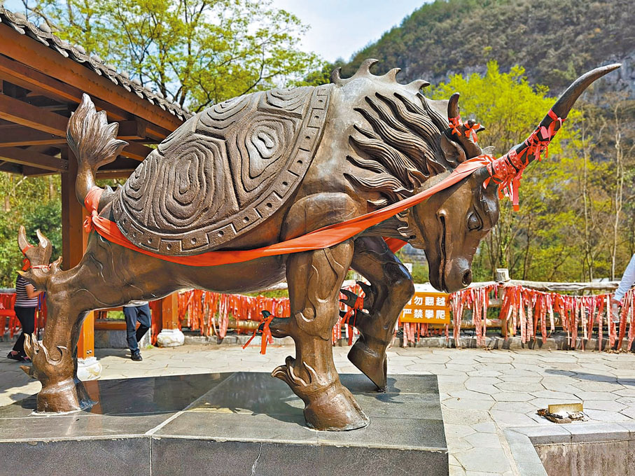而在諸般美景中,最觸動我內心的,還是觀星台上挺立的那尊鄨牛神像。鄨牛亦稱鄨靈,傳為龍王與牛王所生,獨角三腿,力大無窮,曾隨鄨令治水,立下不世功勞。看着那堅毅的眼神,隆起的肌腱,埋頭俯衝的姿態,我彷彿看到了古鄨人在這方水土篳路藍縷,看到了古文明歷數千年而賡續不絕。