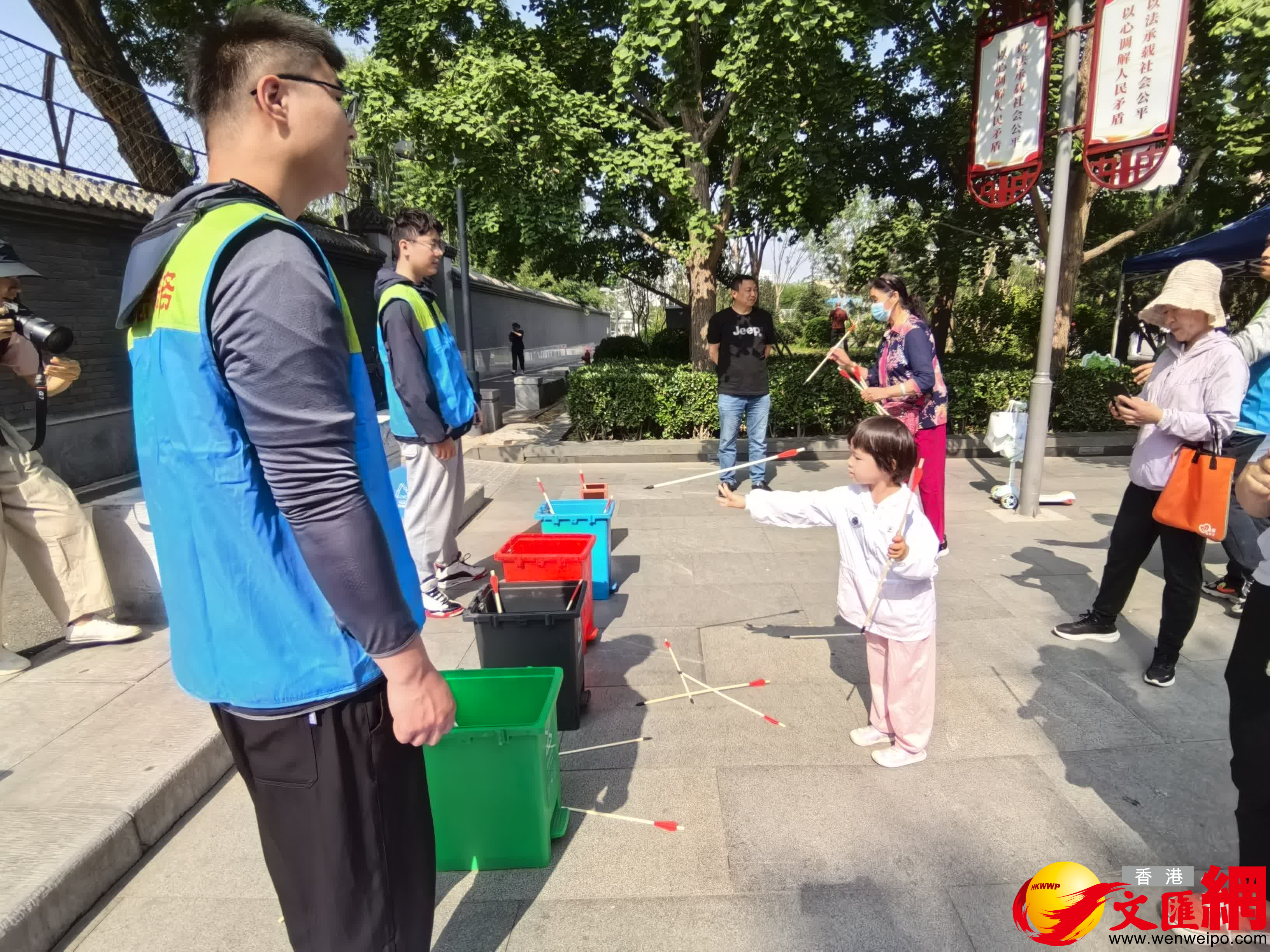 活動現場設置的垃圾分類互動遊戲吸引不少人參與。「用過的礦泉水瓶應該放在綠色的可回收垃圾桶,紅色的垃圾桶是放有害垃圾的」,一名四歲的小朋友一邊玩垃圾分類投箭,一邊向旁邊的小夥伴普及知識。一位附近胡同裏的老居民告訴記者,垃圾分類讓胡同顏值不斷煥新,「現在我們胡同的垃圾桶站已經撤銷,大家聽搖鈴聲出門倒垃圾,以前胡同垃圾桶又臟又臭的場景不再,胡同更敞亮更舒服了。」