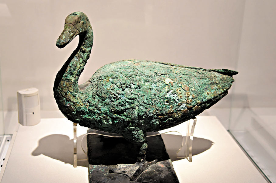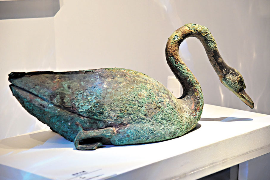 展覽中展出的一件青銅仙鶴,可能正是當年會「聞歌而舞」的「明星」。這件仙鶴姿態高雅、體態修長、動作輕盈,正邁着優雅的步子,在水中低頭覓食。如果仔細觀察,還能發現它身上隱隱可見的彩繪,以及口中銜着的蟲子。