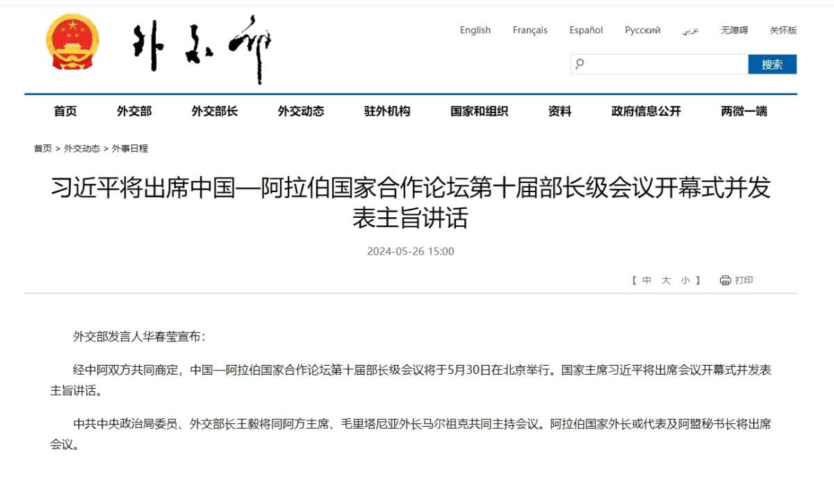 外交部發言人華春瑩26日宣布:經中阿雙方共同商定,中國—阿拉伯國家合作論壇第十屆部長級會議將於5月30日在北京舉行。國家主席習近平將出席會議開幕式並發表主旨講話。