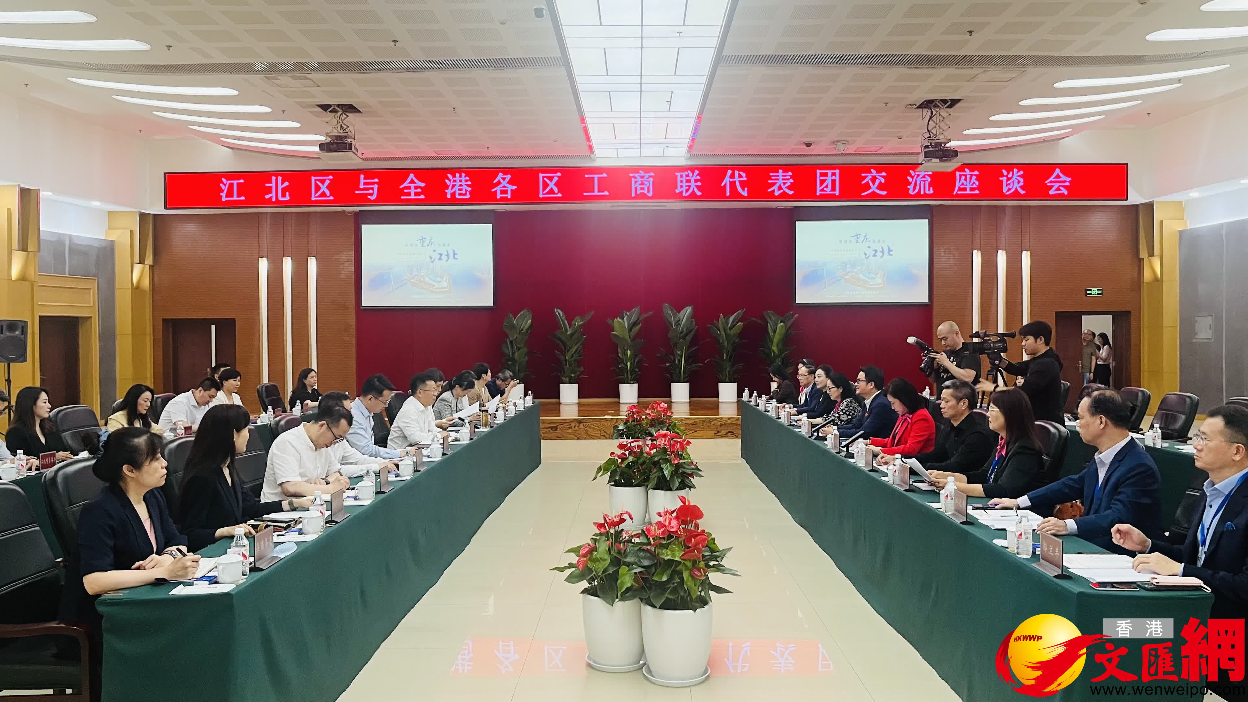 會上,香港全港各區工商聯代表與江北區各部門負責人圍繞營商環境、高質量發展、投資合作、人才引進等方面進行了深入交流,雙方在城市建設、商貿經濟、金融業、現代服務業、新型製造、文化旅遊等領域將開展務實合作,共同打造香港與西部地區互利共贏的樣板和深化友誼的典範。香港全港各區工商聯代表團還前往南洋商業銀行、長安全球研發中心進行實地考察調研。
