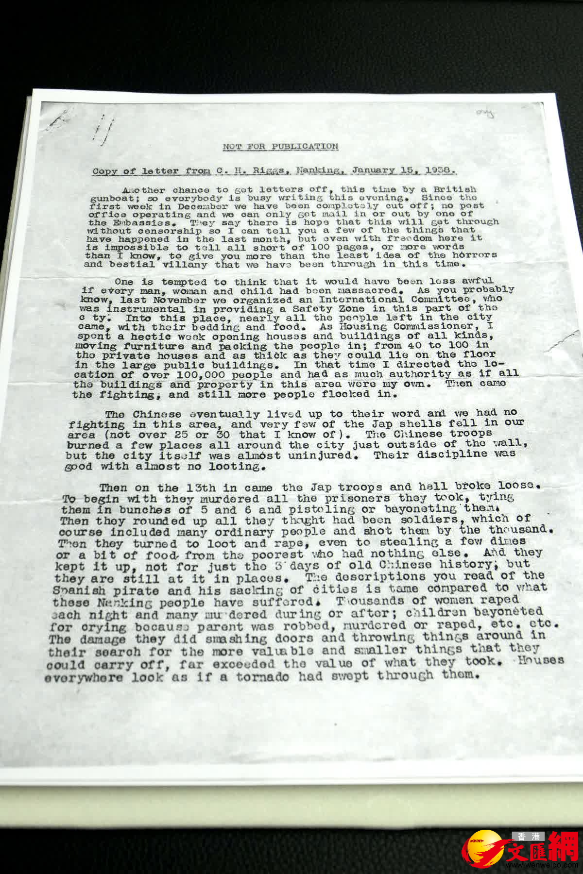 (香港文匯網記者 賀鵬飛 南京報道)5月27日,美籍人士查爾斯·里格斯(Charles Henry Riggs,中文名「林查理」)的後代還向侵華日軍南京大屠殺遇難同胞紀念館捐贈了一封里格斯於1938年1月15日寫給妻子的家書複印件,其中記錄了侵華日軍南京大屠殺暴行。這是侵華日軍南京大屠殺遇難同胞紀念館獲得的又一份重要文獻,又一次佐證了震驚中外的侵華日軍南京大屠殺歷史。