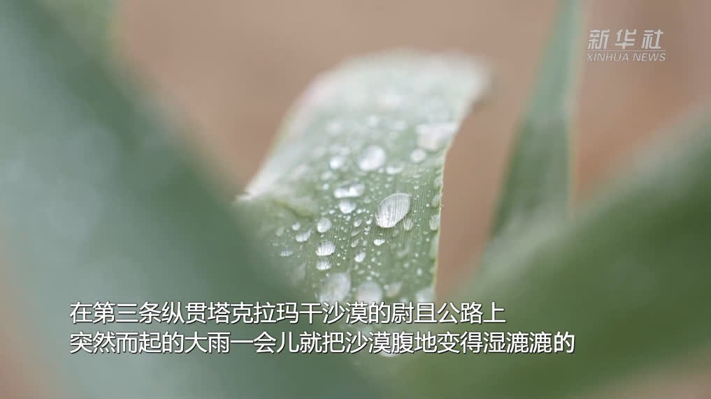 在第三條縱貫塔克拉瑪干沙漠的尉且公路上,突然而起的大雨一會兒就把沙漠腹地變得濕漉漉的,公路兩側用於防沙固沙的草方格也被沖洗乾淨。