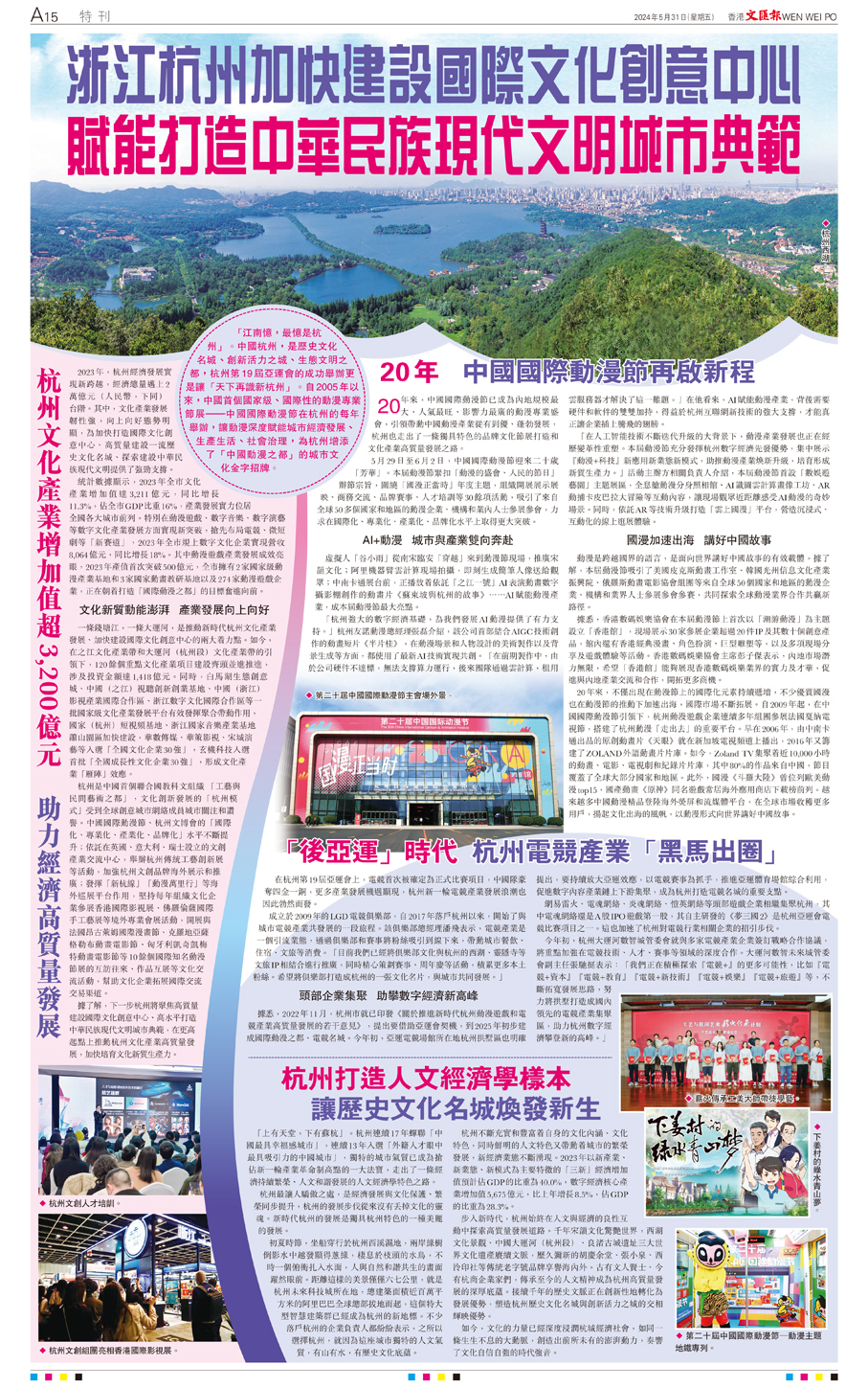 「江南憶,最憶是杭州」。中國杭州,是歷史文化名城、創新活力之城、生態文明之都,杭州第19屆亞運會的成功舉辦更是讓「天下再識新杭州」。自2005年以來,中國首個國家級、國際性的動漫專業節展——中國國際動漫節在杭州的每年舉辦,讓動漫深度賦能城市經濟發展、生產生活、社會治理,為杭州增添了「中國動漫之都」的城市文化金字招牌。