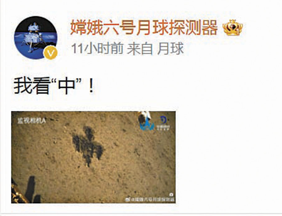 今天(4日),嫦娥六號上升器攜帶月球樣品自月球背面起飛。採樣之後,月背呈現一個「中」字,嫦娥六號月球探測器發了一條微博:我看「中」!