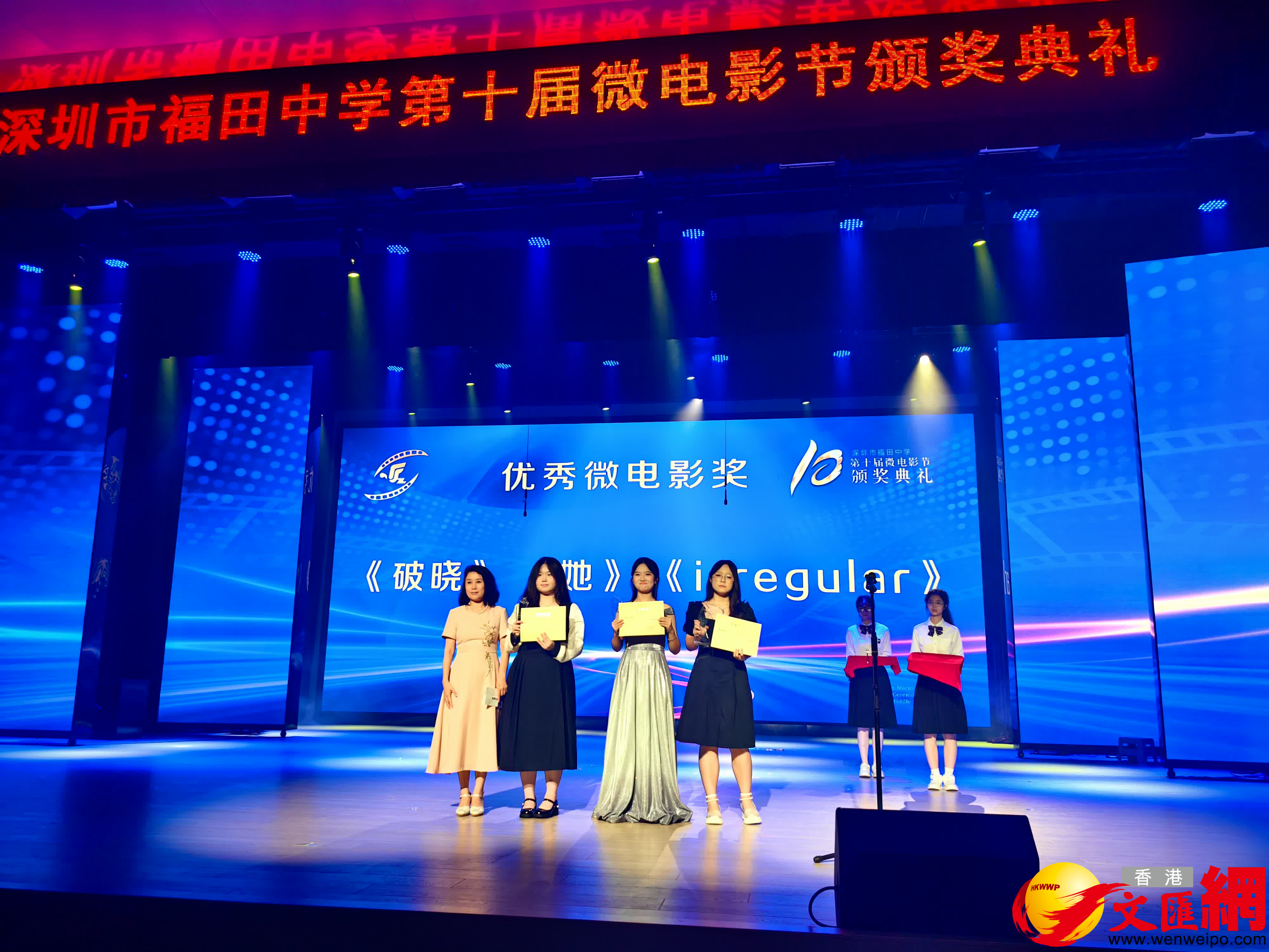 (香港文匯網記者 郭若溪)有這樣一群深圳高中生,編劇、拍攝、剪輯、表演、導演,幹起電影專業活來有模有樣;西裝、禮服,走起紅毯星光熠熠。近日,深圳市福田中學舉行了第十屆原創微電影節頒獎典禮,經過專業評委評選認真評定,選出了最佳導演、最佳編劇、最佳攝影等各大獎項的獲得者,其中作品《我和我》包攬了多個大獎,更是被選為本屆電影節的最佳微電影金獎作品。
