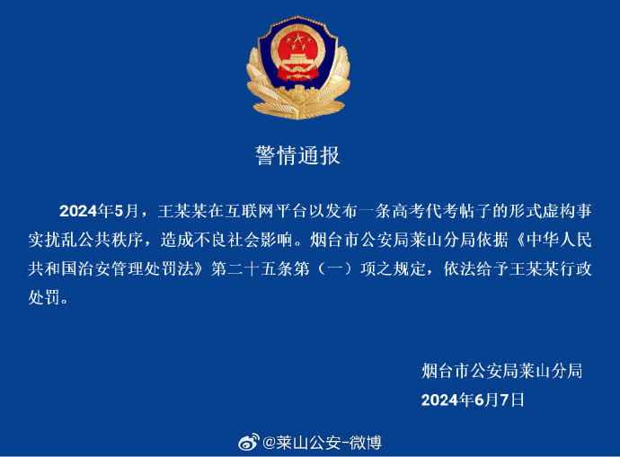2024年5月,王某某在互聯網平台以發布一條高考代考帖子的形式虛構事實擾亂公共秩序,造成不良社會影響。煙台市公安局萊山分局依據《中華人民共和國治安管理處罰法》第二十五條第(一)項之規定,依法給予王某某行政處罰。