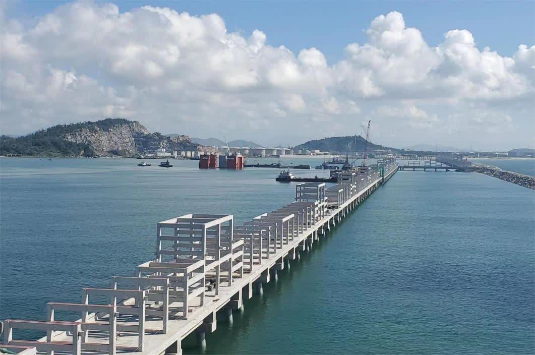 該「公用管廊棧橋」水域段公用管廊採用鋼管樁樑板結構,陸域段公用管廊採用灌註樁樑板結構,油品碼頭由1個工作平台、2個靠船墩和6個系纜墩組成。「這個項目建成後,對穩定粵西及周邊地區能源市場,提高我國能源儲備能力,推動港口物流的進一步疏通,推動區域經濟可持續性發展具有重要意義。」茂名港集團油品碼頭項目臨時黨支部書記兼項目經理梁祖釗介紹。