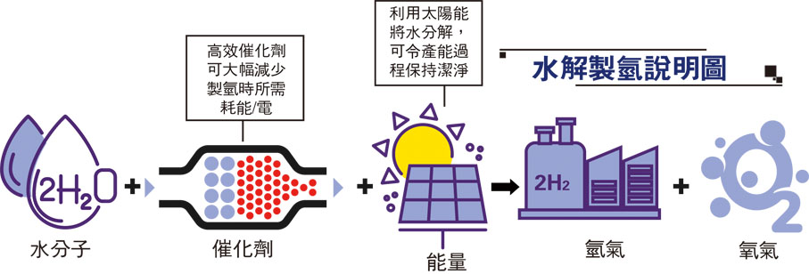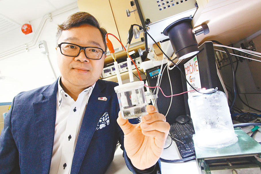 為此,何頌賢團隊研發出「用於製氫的太陽能驅動電催化系統」,將太陽能光伏,結合新型3D多孔微納米結構材料製成的高效穩定的雙陽極——陰極,從而提高催化材料在轉化氫能時效能和穩定性,系統去年更獲得第四十八屆日內瓦國際發明展頒發金獎。