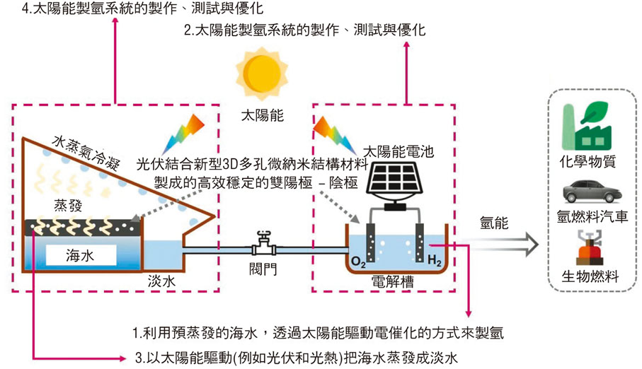 系統中的微納結構電催化劑(micro-nanostructure electrocatalysts)具多功能性和高性能,可以按需生成較大規模和低成本的氫氣。何頌賢向香港文匯報表示,該系統可達至雙重目標:一是以太陽能驅動(例如光伏和光熱)把海水蒸發成淡水,二是利用預蒸發的海水,透過太陽能驅動電催化的方式來製氫,「這相當於我們可不受地區限制,只要有水和太陽的地方,都可以使用水分解的技術生產氫氣,因此可以大規模部署相關系統,從當地海水中生產環保和低成本的氫燃料,潔淨的能源載體替代方案。」