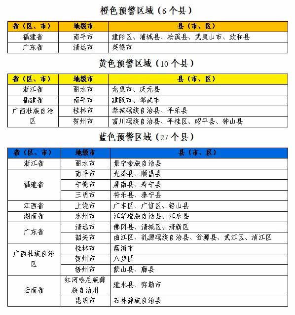 預計,6月14日20時至6月15日20時,浙江南部、福建西北部、廣東北部、廣西東部等地部分地區發生山洪災害可能性較大(黃色預警),其中,福建西北部、廣東北部局地發生山洪災害可能性大(橙色預警),預警區域涉及的縣(市、區)見下表。其他地區也可能因局地短歷時強降水引發山洪災害,請各地注意做好實時監測、防汛預警和轉移避險等防範工作。