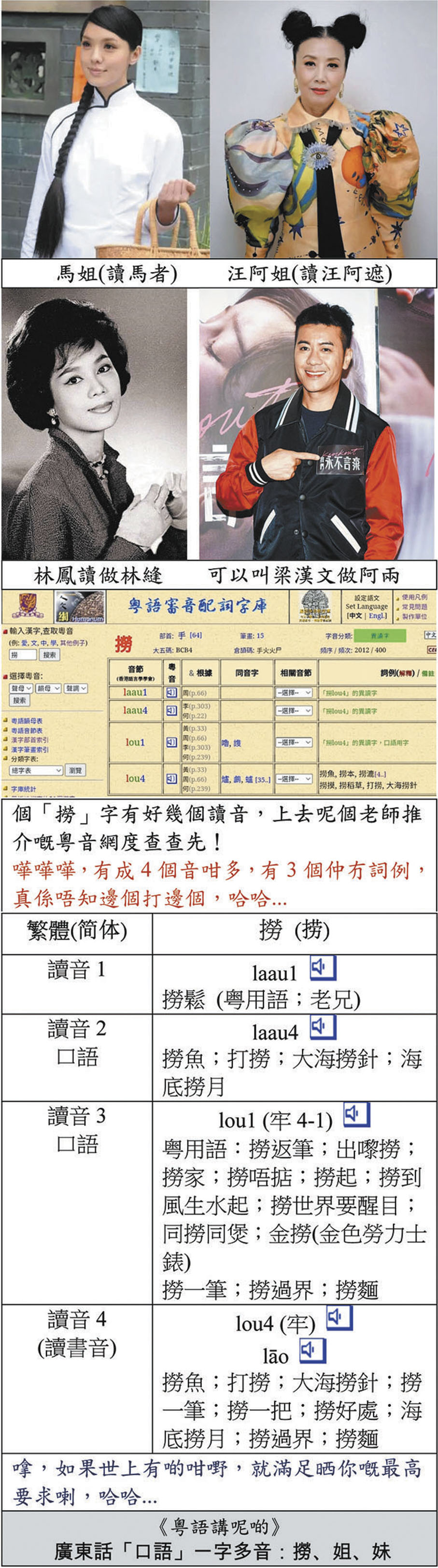 就圖中帶出的課題,筆者相信不少行內人馬上會說:「坊間不是已經有一個查閱粵音的網頁了嗎?」是的,可問題是個別字的讀音,尤其「口語」,並不齊備;且沒有詞例提供,予人得物無所用。約在十年前,筆者就有建立一個「粵音口語庫」的構想,而這亦是「粵語保育及傳承」的重要環節之一。若然只是由個體就相關內容開個普通網頁,效果應大打折扣。筆者於是聯繫了幾位同道中人就該項目的發展路向進行相討──一致認定項目由香港相關學術單位(有內地單位更佳)牽頭才可確立其認受性。當事時,筆者有幸獲得前港大中文系系主任單周堯教授(當今文壇巨擘)首肯出任該項目的義務顧問(包括審閱部分資料),且在其能力範圍內向大專界推薦及串聯開發單位。單教授就是本著他所說的「眾人之事」,在隨後三年騰出不少時間和筆者商談項目內容從而完善項目計劃。筆者也成功說服了某大學相關學系願意牽頭,並向「語文基金會」申請撥款資助發展該項目,最終卻因種種原因令計劃胎死腹中。之後,筆者也曾作出多方嘗試,惜徒勞無功,令一個饒有意義的項目宣告壽終正寢。