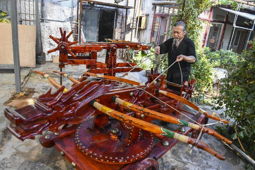 在曲阜明故城牆西面的胡同裏,坐落着一個掛有「徐弓坊」門牌的小院,院內擺放着一排巨大的古代攻城武器。「這是投石車、這是弩車,這些大傢夥可不是玩具,該有的機關一樣不少,裝上巨箭馬上就能射出去。」談到按1:1比例還原攻城武器的初衷,省級非遺弓箭製作技藝代表性傳承人徐明坤說,通過可視化的實物進行傳統文化實體化講解,給非遺技藝找到了一個新的出口。不論是以推廣活字印刷為目的設計的「掃碼尋字印章」,還是鄒城市攜手京東推出的「仉萌人」系列孟母教子文創,不斷推陳出新的文創產品,從微觀層面建立起了傳統與時代的關聯,吸引着年輕人深入了解傳統文化。