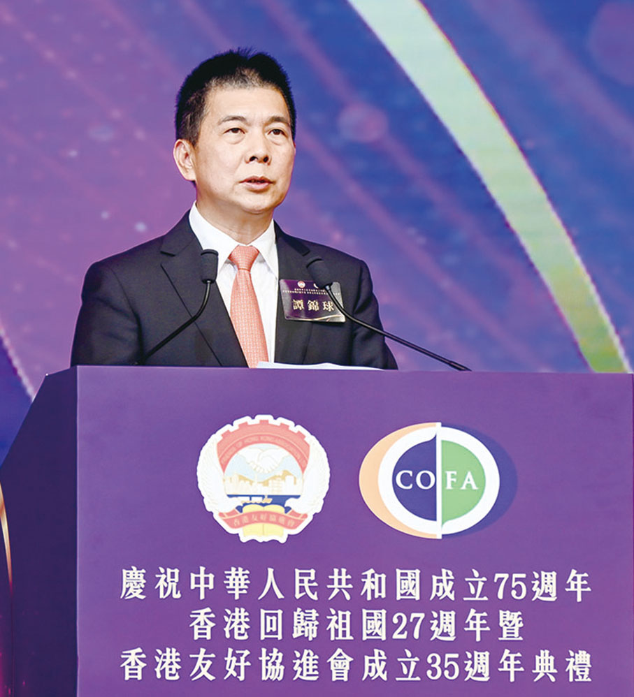會長譚錦球表示,今年是中華人民共和國成立75週年、香港回歸祖國27週年,也是香港友好協進會成立35週年。行政長官李家超、中央政府駐港聯絡辦主任鄭雁雄分別為友好協進會題辭;全國人大常委會代表工作委員會、全國政協港澳台僑委員會、中華海外聯誼會先後發來賀信。這是極大的鼓勵和支持,我們會銘記在心,並化作扎實的行動。譚錦球還回顧了協進會成立35年來,始終秉持愛國愛港的創會宗旨,堅持「一國兩制」方針和基本法,支持國家高質量發展,支持特區政府依法施政,致力為港區全國人大代表、全國政協委員和中華海外聯誼會理事等愛國愛港人士,構建一個有助於在香港更好發揮「雙重積極作用」的活動平台、學習平台和工作平台。
