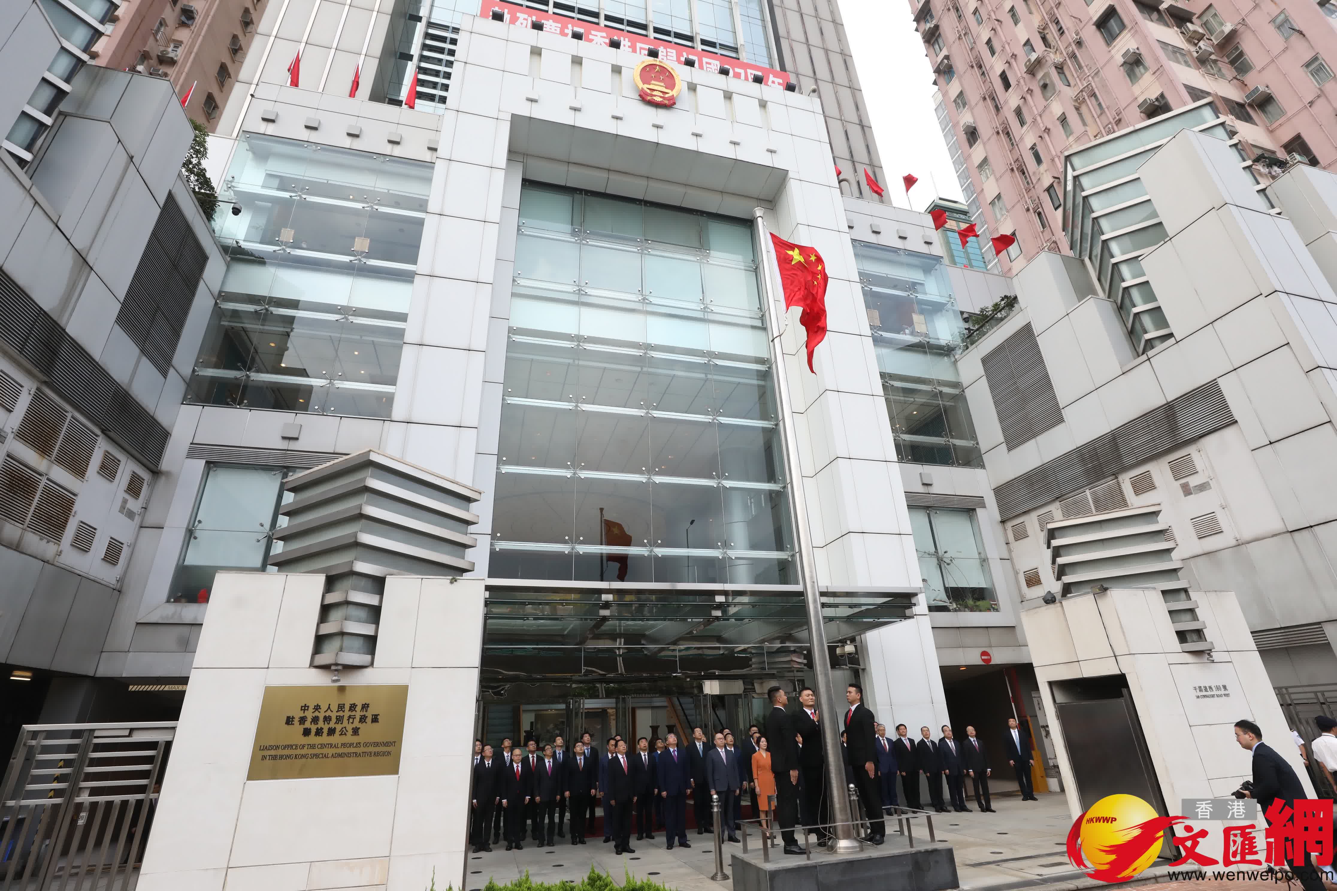 上午7時,升國旗儀式開始。中央政府駐港聯絡辦主任鄭雁雄,副主任盧新寧、羅永綱、何靖、尹宗華和秘書長王松苗,以及幹部員工代表在辦公樓前莊嚴肅立。升旗手邁着鏗鏘有力的步伐,護送國旗走向升旗台。伴隨着雄壯激昂的國歌聲,鮮艷的五星紅旗冉冉升起,迎風招展。全體人員向國旗行注目禮,齊聲高唱國歌,表達對祖國和香港的美好祝福。