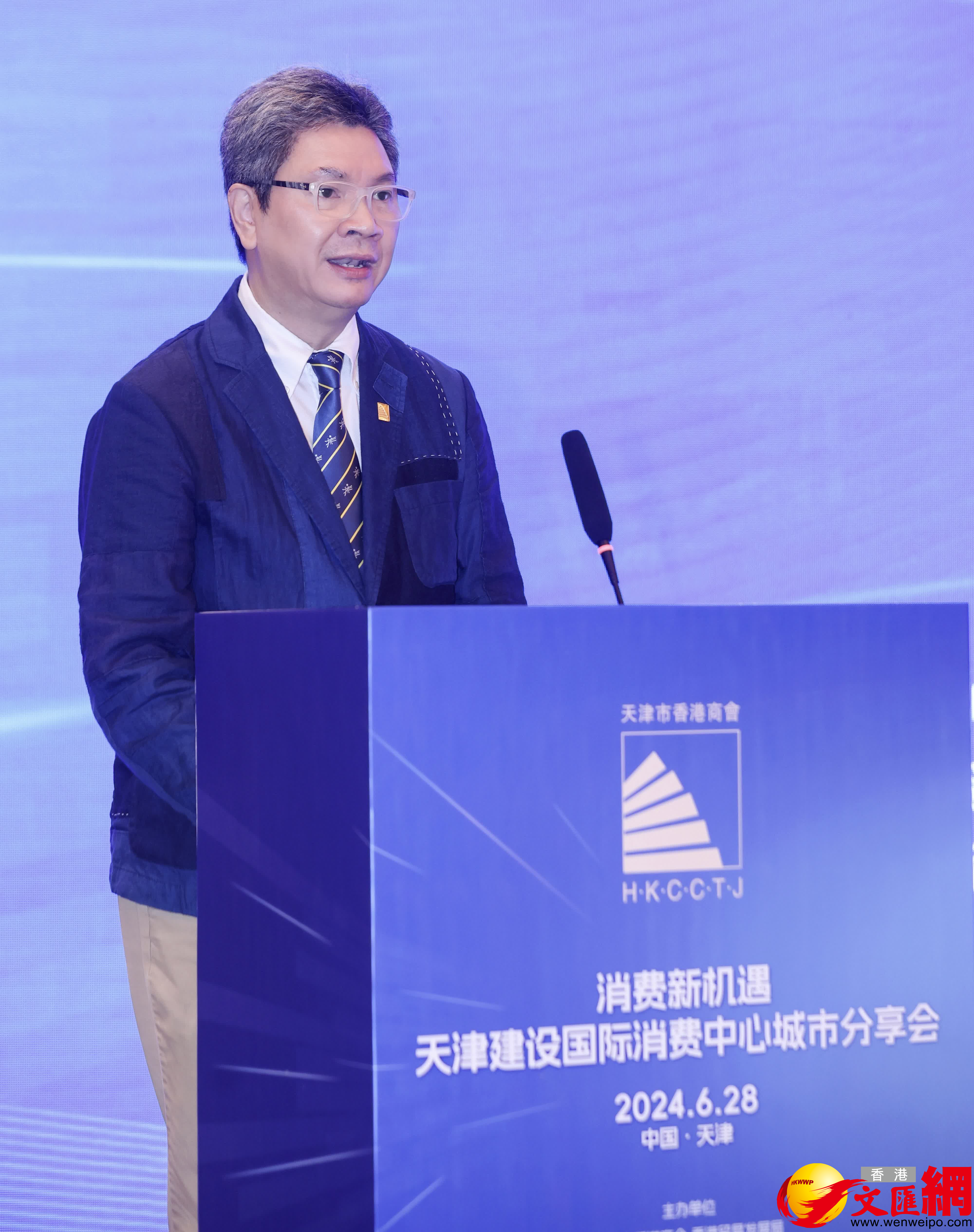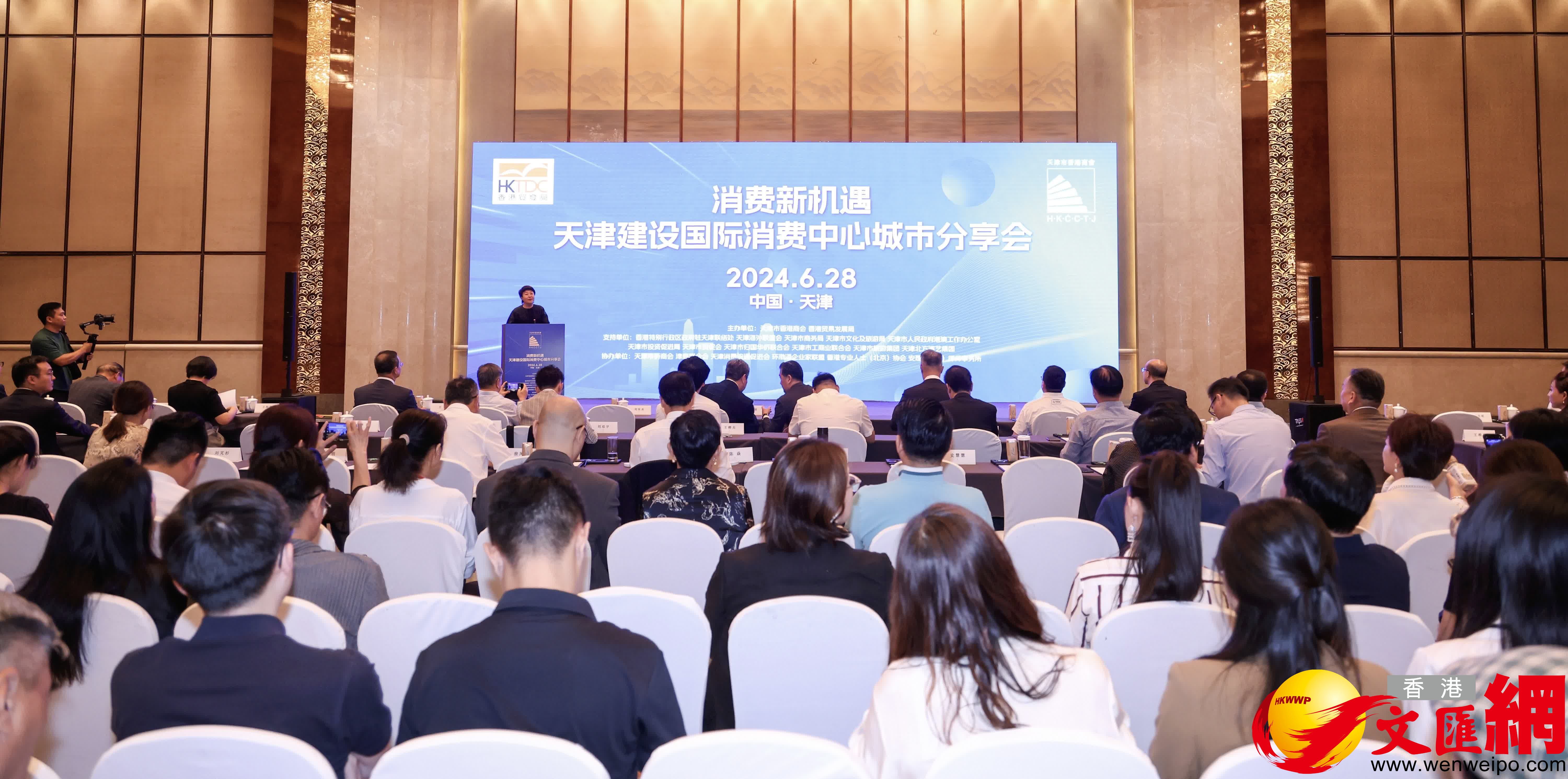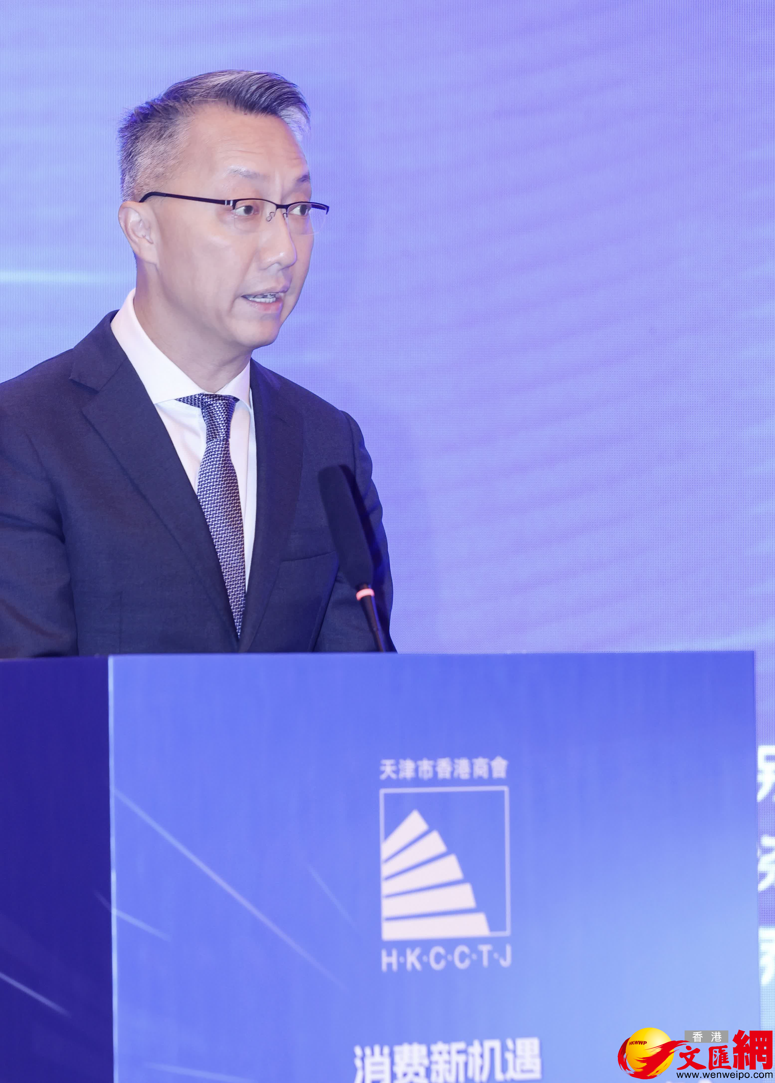 (香港文匯網記者 張聰 天津報道)為進一步深化津港交流合作,日前,由天津市香港商會、香港貿易發展局聯合主辦的「消費新機遇:天津建設國際消費中心城市分享會」在津舉行,來自津港兩地政府機構、天津市知名商協會負責人、津港優秀企業家代表共230餘人參加本次論壇。香港貿易發展局東北、華北首席代表陳嘉賢在致辭上指出,港商可以為天津培育新的消費增長點和優勢產業提供有力支持。
