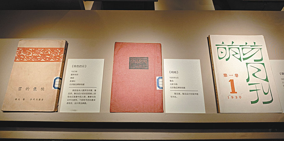 作為「五四」新文化運動以來中國現代書籍裝幀設計的開拓者和奠基人,《凱綏·珂勒惠支版畫選集》並非魯迅唯一親手設計的作品。展覽中的《吶喊》《桃色的雲》《萌芽月刊》第1卷和《海燕》創刊號等均由他設計封面和題寫書名、刊名。其中,《吶喊》等充滿強烈象徵主義風格與現代性的設計,《桃色的雲》以漢畫像中的人物、禽獸與流雲作為裝飾的封面,都折射出魯迅對藝術的思考與運用。