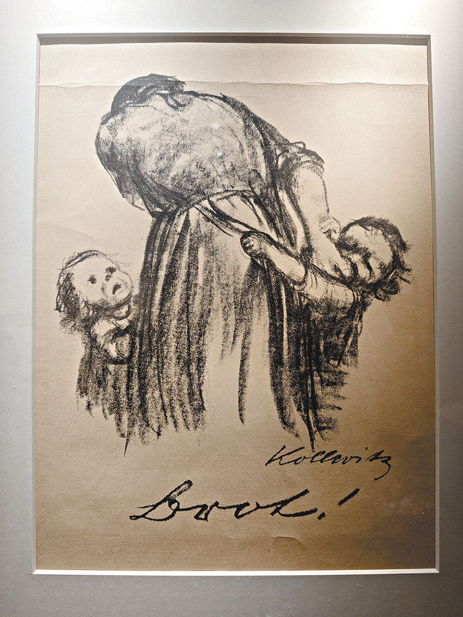 魯迅對於版畫傾注的熱情,通過他的收藏即可窺見。德國版畫家凱綏·珂勒惠支是他最為推崇的版畫家之一。魯迅欣賞她以尖銳的形式傳達出資本主義制度下工人階級的悲慘命運和勇於鬥爭的精神,對其深刻的社會批判和精湛的藝術表現力大加讚賞。1936年,魯迅自費編印出版了《凱綏·珂勒惠支版畫選集》,親自設計版面、撰寫序言。這本畫集以及魯迅收藏的多幅珂勒惠支版畫作品如《反抗》《織工隊》《麵包》等也亮相是次展覽,其中《麵包》是凱綏·珂勒惠支最著名的作品之一,展現了其對現實生活的苦難和悲劇的探討。