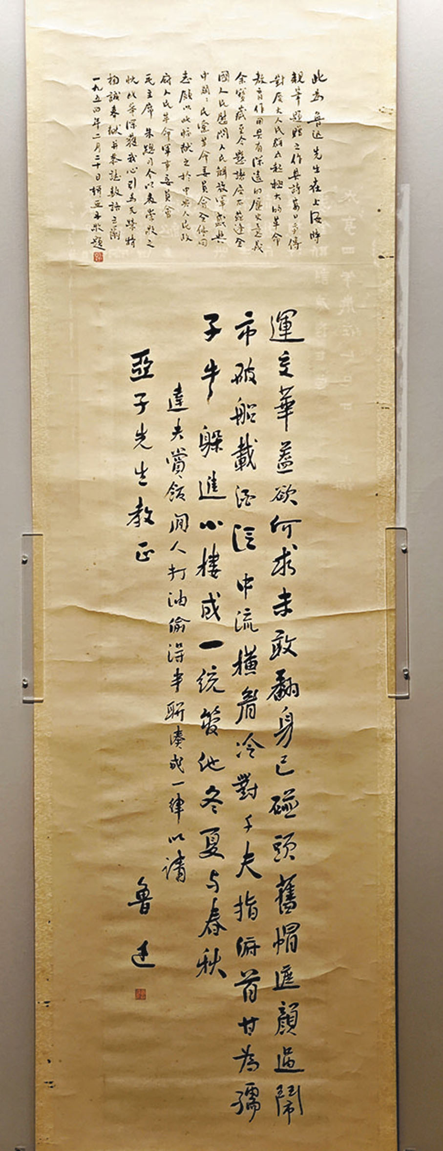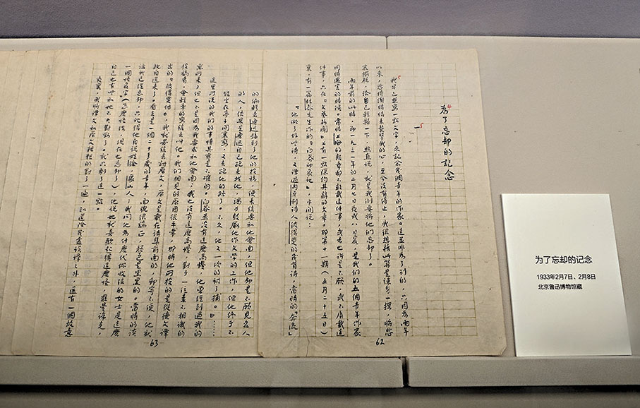 魯迅雖未以書法家自居,但嚴格的幼學、嚴謹的師承及對毛筆書法的酷愛,使其形成了獨特的風格。從現存的大量手稿來看,魯迅皆工篆、隸、行、楷諸體,書風繼碑派一路,寬博沉雄、簡淡古雅,被郭沫若評價為「遠逾宋唐,直攀魏晉」。是次展覽精心挑選了魯迅的詩稿《贈柳亞子(自嘲)》《贈沈松泉(偶成)》等作品,以及他致許廣平、鄭振鐸、蕭紅等人的書信,讓觀眾直觀感受其書法的風韻。而長達15頁《為了忘卻的記念》手稿也在展出之列,透過一頁頁手稿,觀眾可以感受到魯迅「怒向刀叢覓小詩」的悲憤。
