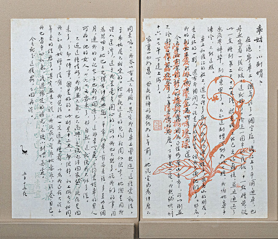 值得一提的是,魯迅致許廣平的信很是別具匠心,展現出難得的溫情和柔軟。展覽中的這封信寫於1929年5月魯迅北上探親期間,此時適逢許廣平懷孕待產,也是兩人自1926年以來第一次分離,信中言語眷戀有加,表達着他對愛人的深厚情誼和關愛。魯迅親暱地稱呼許廣平為「乖姑」、「小刺猬」,細述所見所聞所感,還在信末畫上一隻「小白象」。所用信箋則分別繪有許廣平喜愛的枇杷和寓意着孕育其子的蓮蓬,因此許廣平在回信中都說「那兩張紙必不是隨意選擇的」。