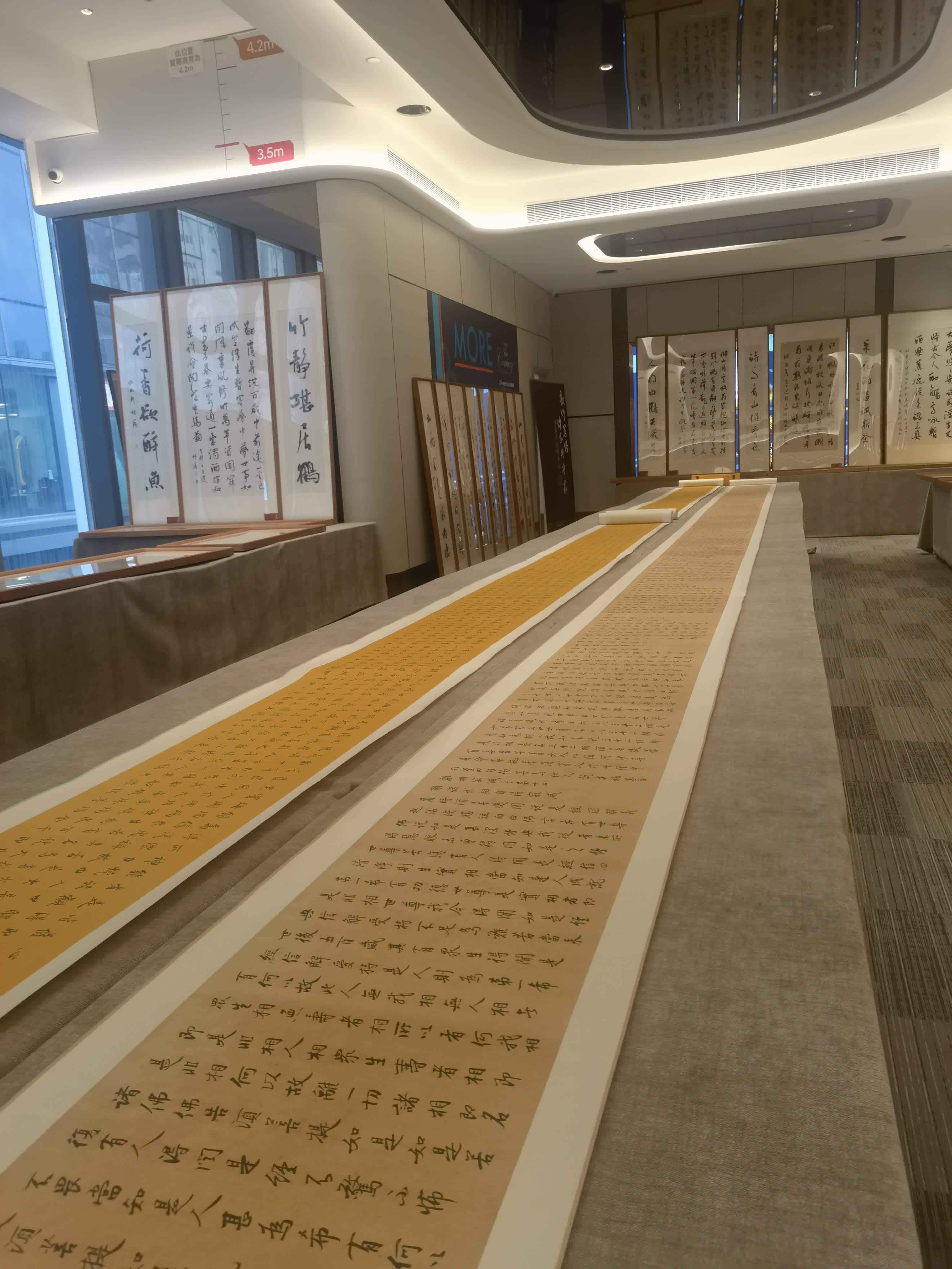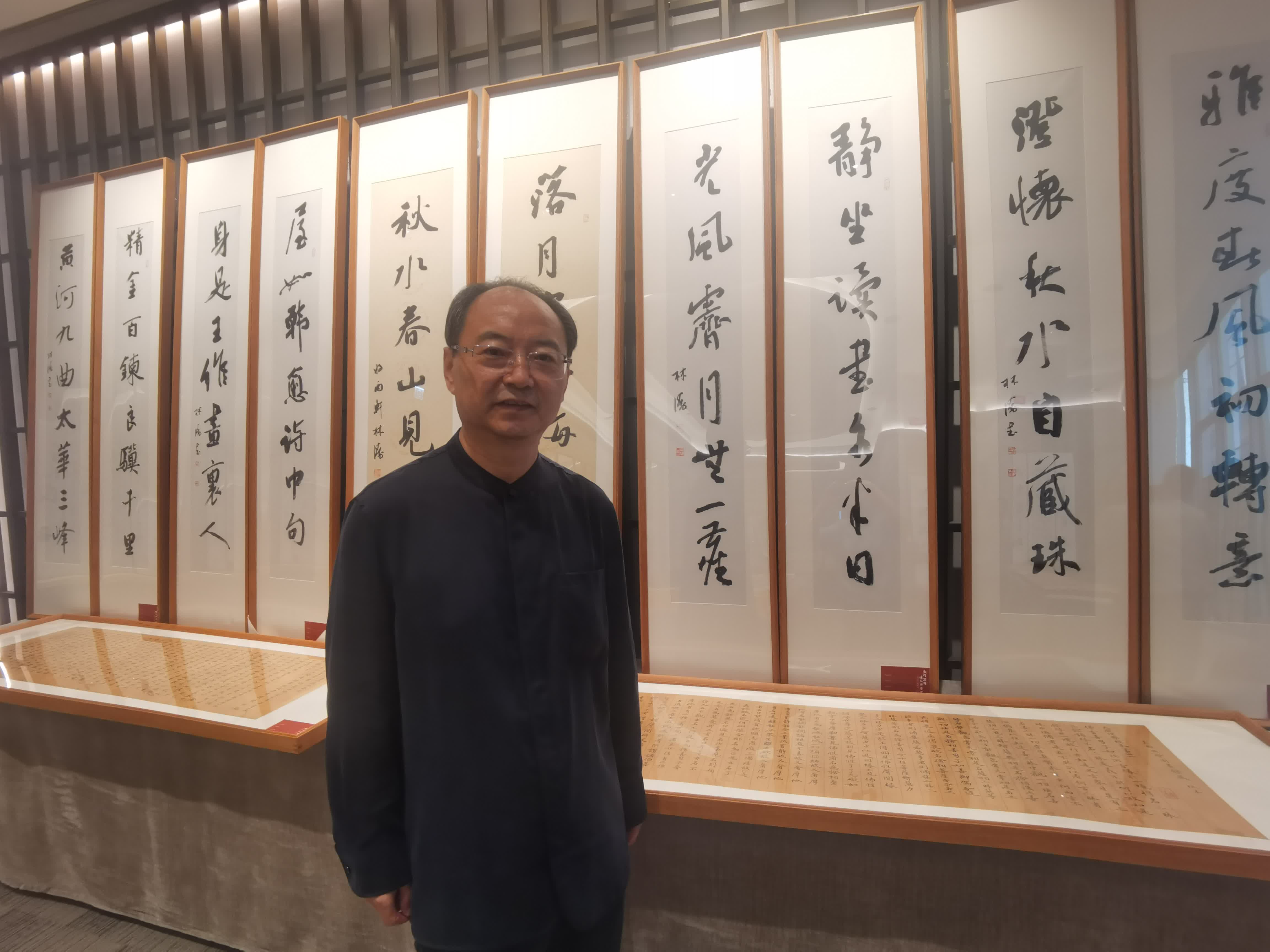 展廳中庭擺放的是長達26米長,共5000多字的行書作品《金剛般若波羅蜜經》,「我在書寫佛經時,也會吸收敦煌寫經元素,繼而追求禪的意境。」林濤說。